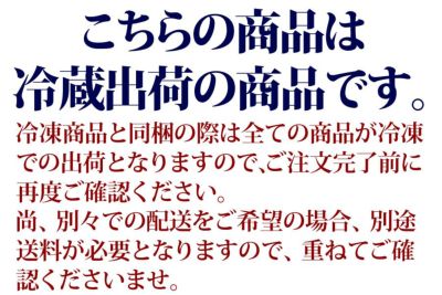 ※冷凍商品と同梱の際は全ての商品が冷凍での出荷となりますので、ご注文完了前に再度ご確認ください。尚、別々での配送をご希望の場合はご注文の際に備考欄にお書き添えいただくか、お電話にてご連絡頂きます様お願い致します。その際の送料は、別途必要となりますのでご了承くださいませ。