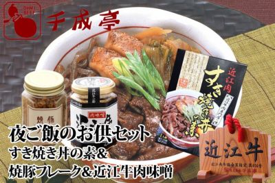 近江牛肉すき焼き丼の素:1袋(180g) 秘伝の焼豚フレーク:1個(70g) 近江牛の肉味噌:1個(130g)