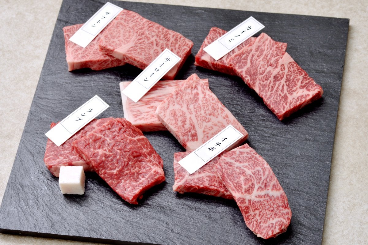 イチボ、カイノミ、ザブトン、ランプ、サーロインのステーキセットです。赤身・霜降り・やわらかさの異なる5部位を一度にお楽しみいただけます。ギフトにはもちろん、特別な日のメインディッシュにもおすすめです。