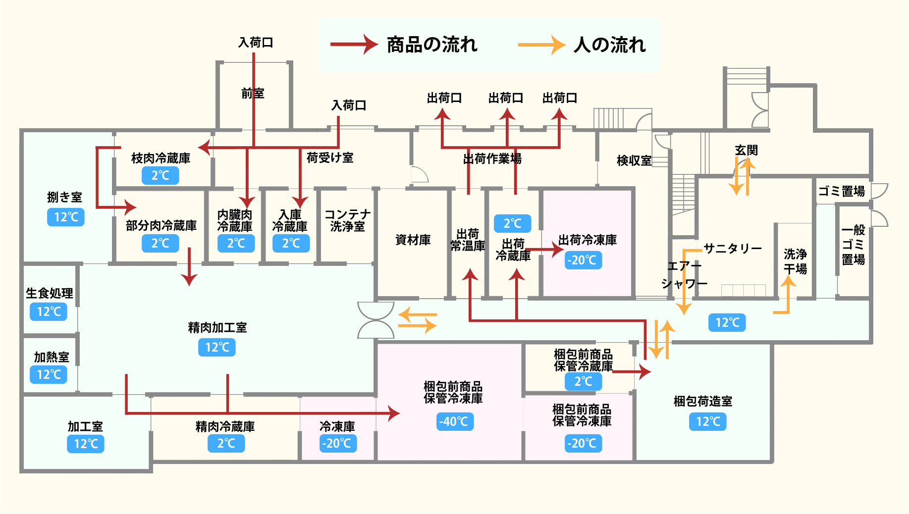 加工場内は、作業員・商品に直接冷気が当たらない空調システムを取り入れ、室内を均一的に12℃に保つことで、食中毒菌の繁殖を防ぐとともに、食肉の鮮度を最高に状態に維持しています。