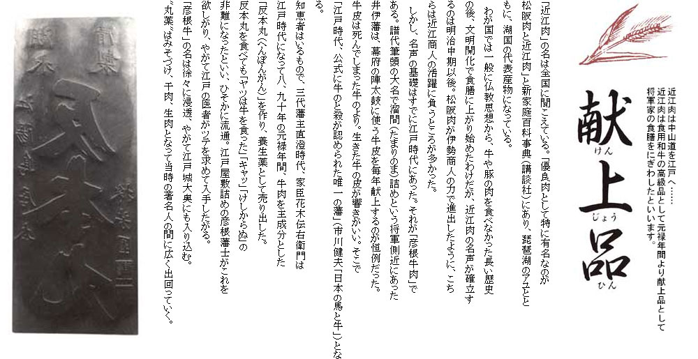 寛政年間以降、彦根藩から将軍家や諸大名へ牛肉を贈った記録が「御城使寄合留帳」として残されている。いずれも相手方から所望に応じて贈ったものである。寛政9年には、幕府から製法を尋ねられている。このことから幕府、大名が牛肉の効能を認識していたと思われる。