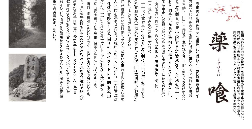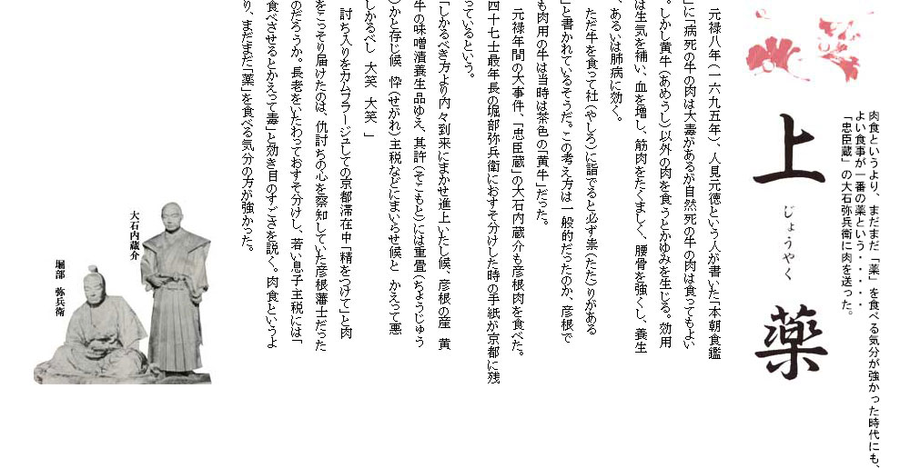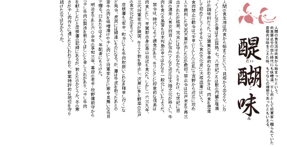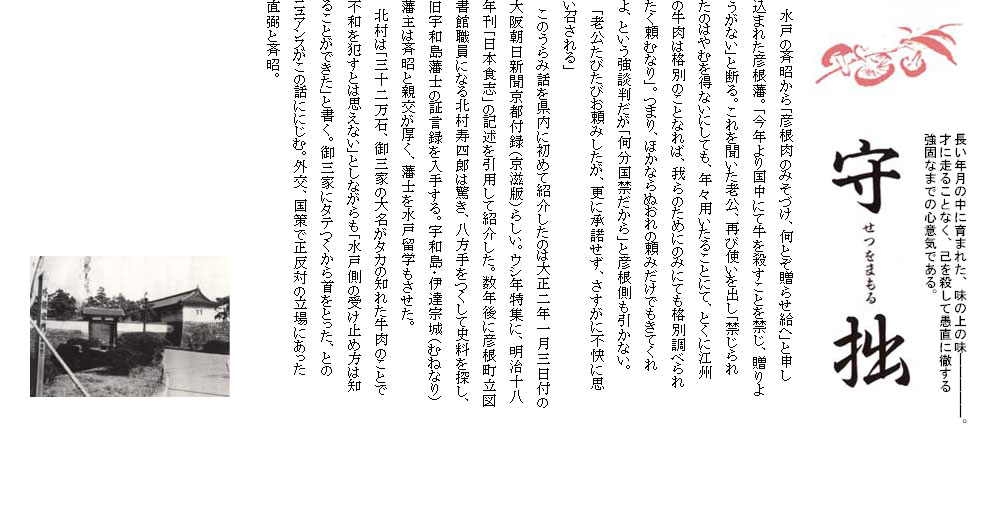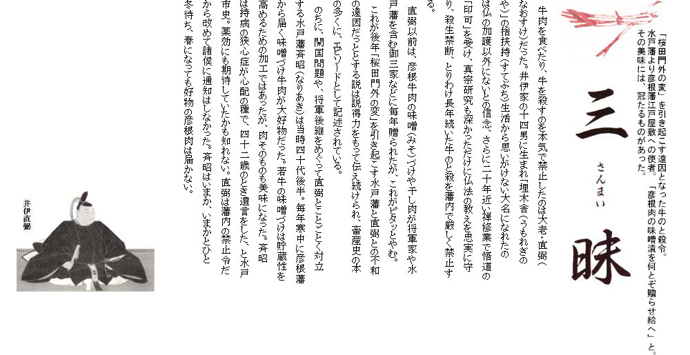 井伊直弼は、仏法の教えを忠実に守り牛の屠殺を藩内で禁止する。直弼以前は、将軍家や御三家などに毎年贈られたがピタッと止む。開国問題や将軍後継をめぐって対立する水戸藩主徳川斉昭は、彦根牛の味噌漬が大好物だった。斉昭はいまかと待つが届かない。やがて使者を出し「彦根肉の味噌漬を何とぞ贈らせ給へ」と頼むのである。「牛を殺すことを禁じ、贈りようがない」と彦根藩。「禁じられたのはやむを得ないにしても…格別調べられたく頼むなり」と強談判だが「何分国禁ゆえ」と彦根藩も引かない。「老公たびたびお頼みしたが承諾せず、さすがに不快に思い召される」。これが後年、「桜田門外の変」を引き起こす水戸藩と直弼との不和の遠因だったとする説は、説得力をもって伝えられた。