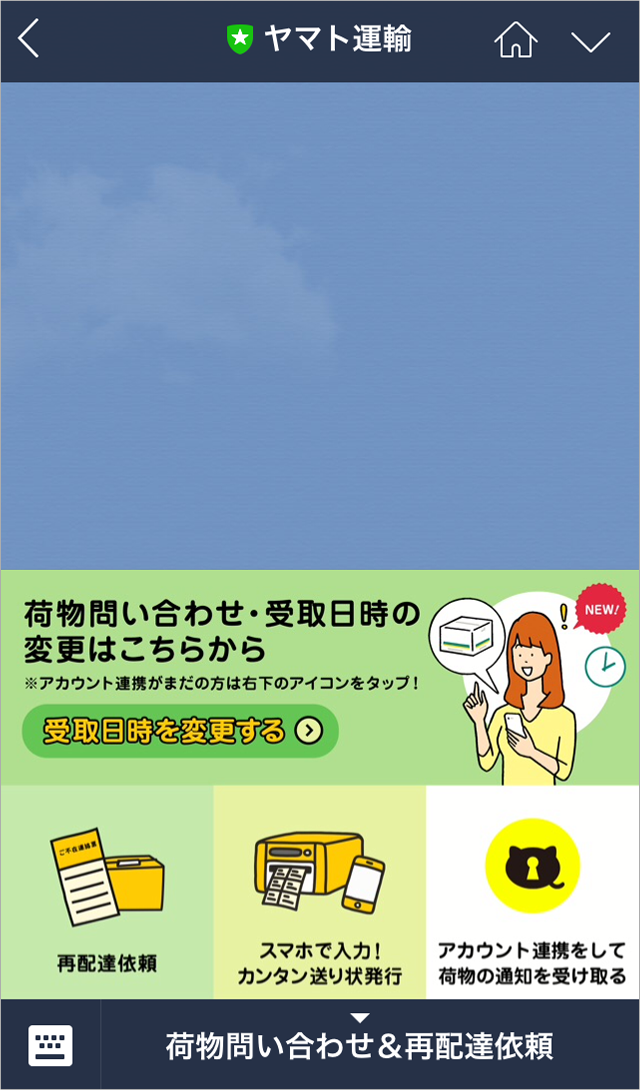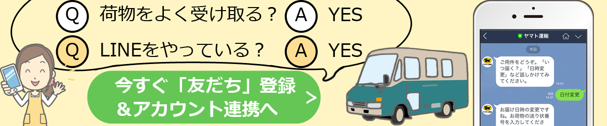 「お届け予定eメール」と「ご不在連絡eメール」の通知をLINEメッセージで受け取れます。メッセージから、受取日時の変更やコンビニ等での受け取りに変更することができます。