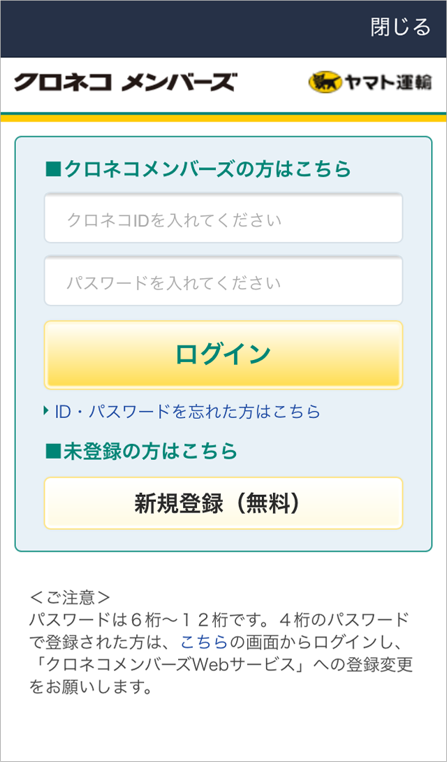 クロネコIDをお持ちでない方こちらから新規登録(無料)をお願いします。