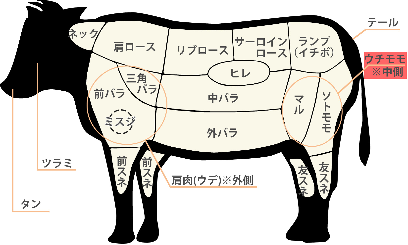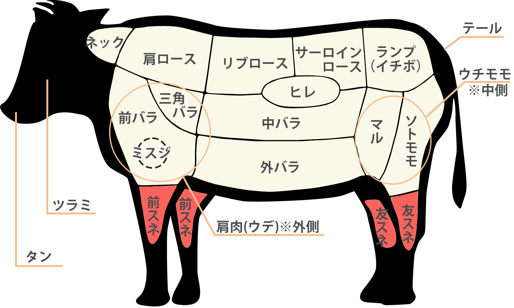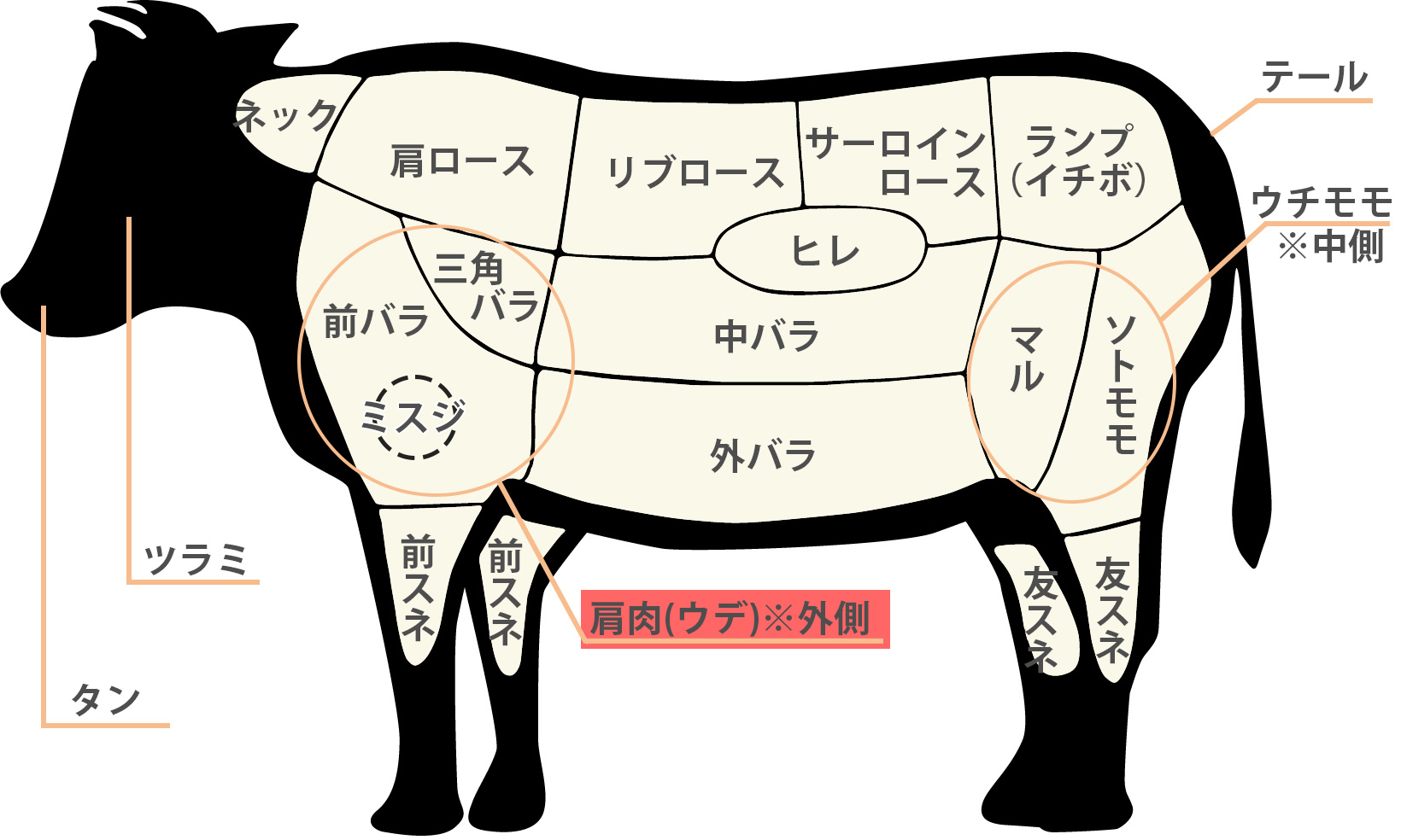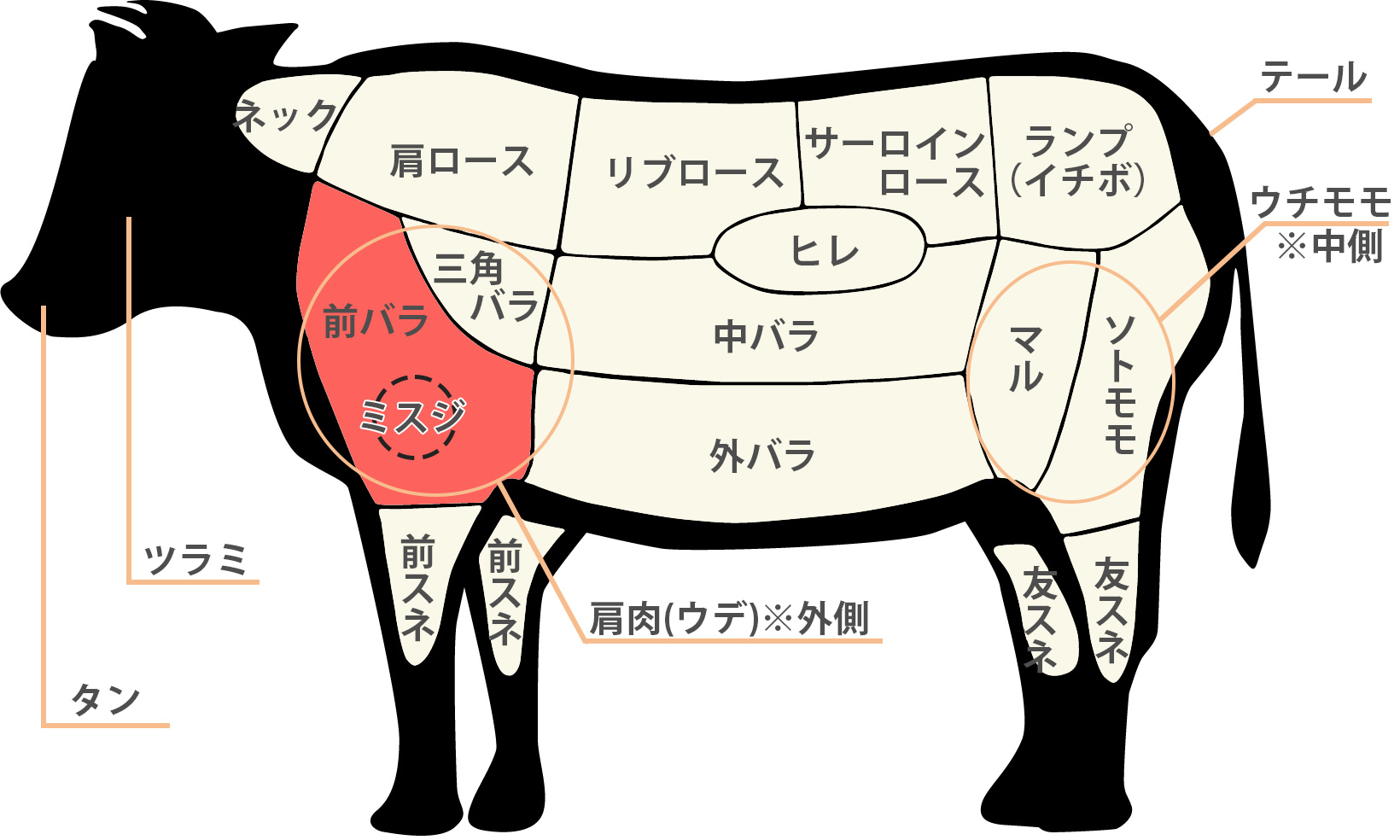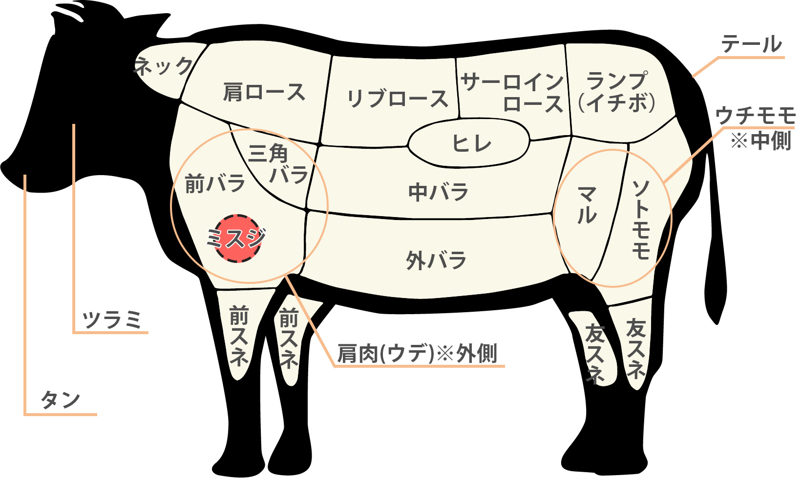 ミスジ:肩甲骨の裏あたりの「ウデ肉」にあたる部位