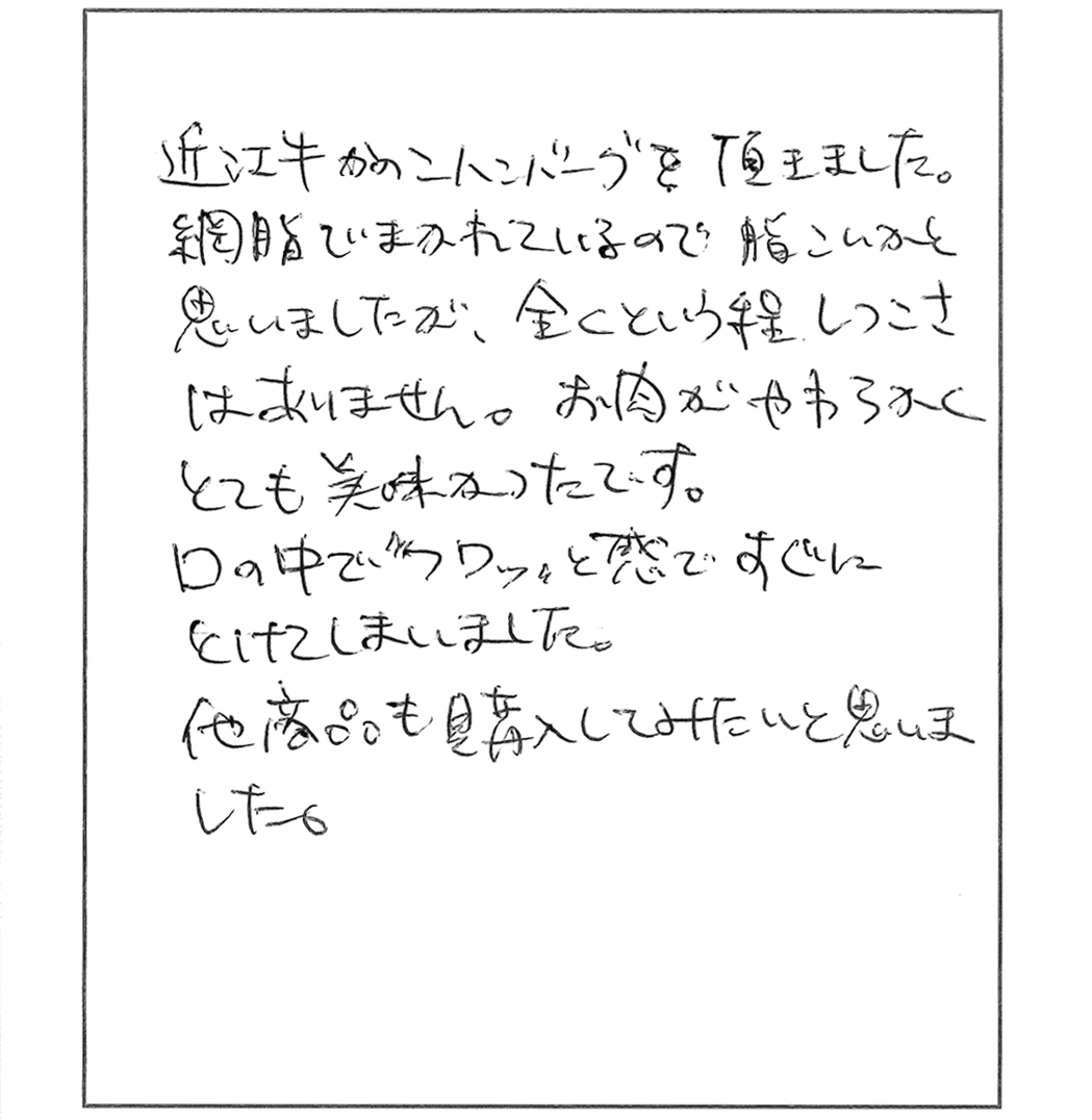 滋賀の近江牛専門店・近江牛ステーキ【千成亭】 HOME > お客様からの喜びのお声・口コミーハンバーグ編