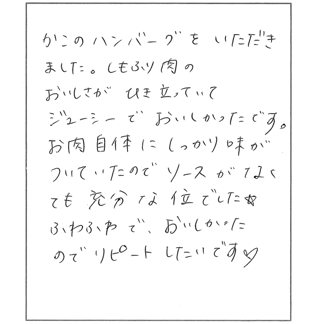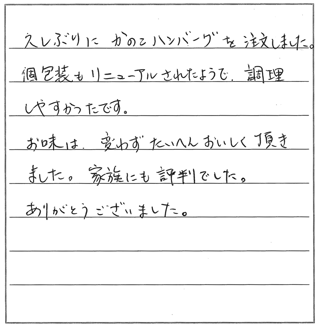 80代の母から10才のおいっ子までみんなかのこハンバーグの大ファンです。