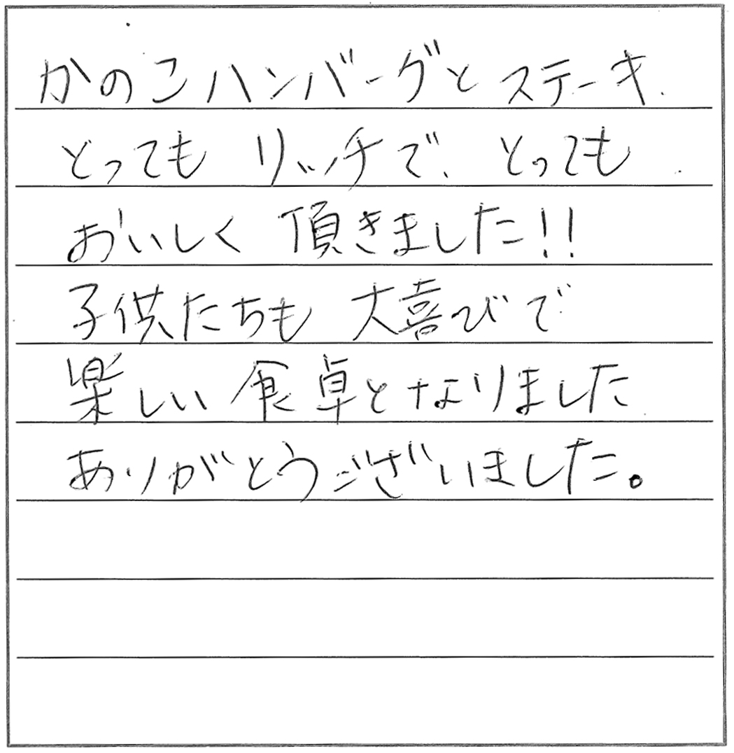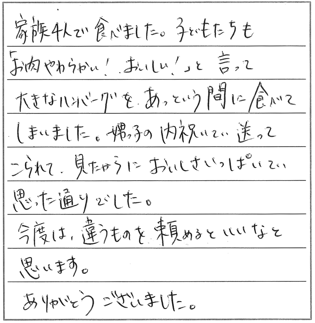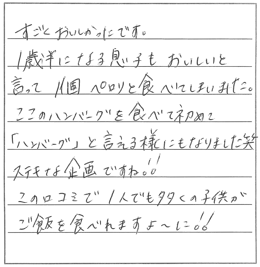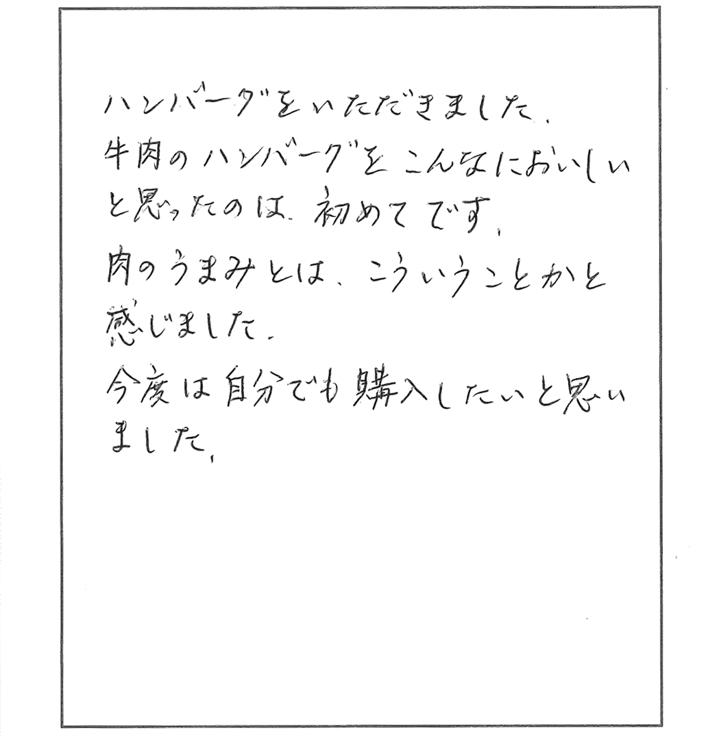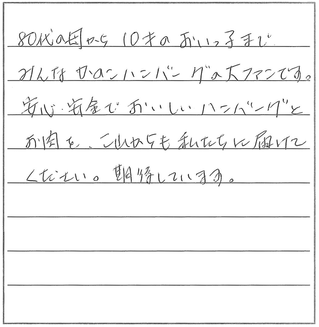 安心・安全でおいしいハンバーグとお肉を、これからも私たちに届けてください。