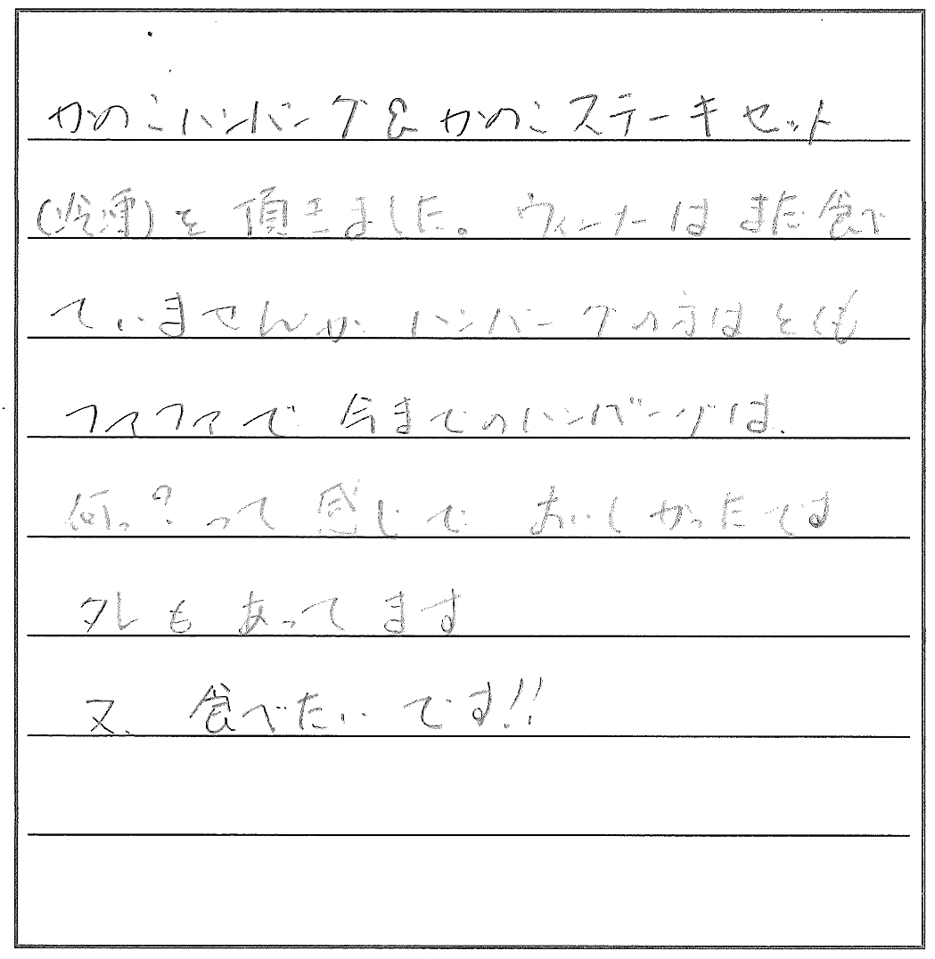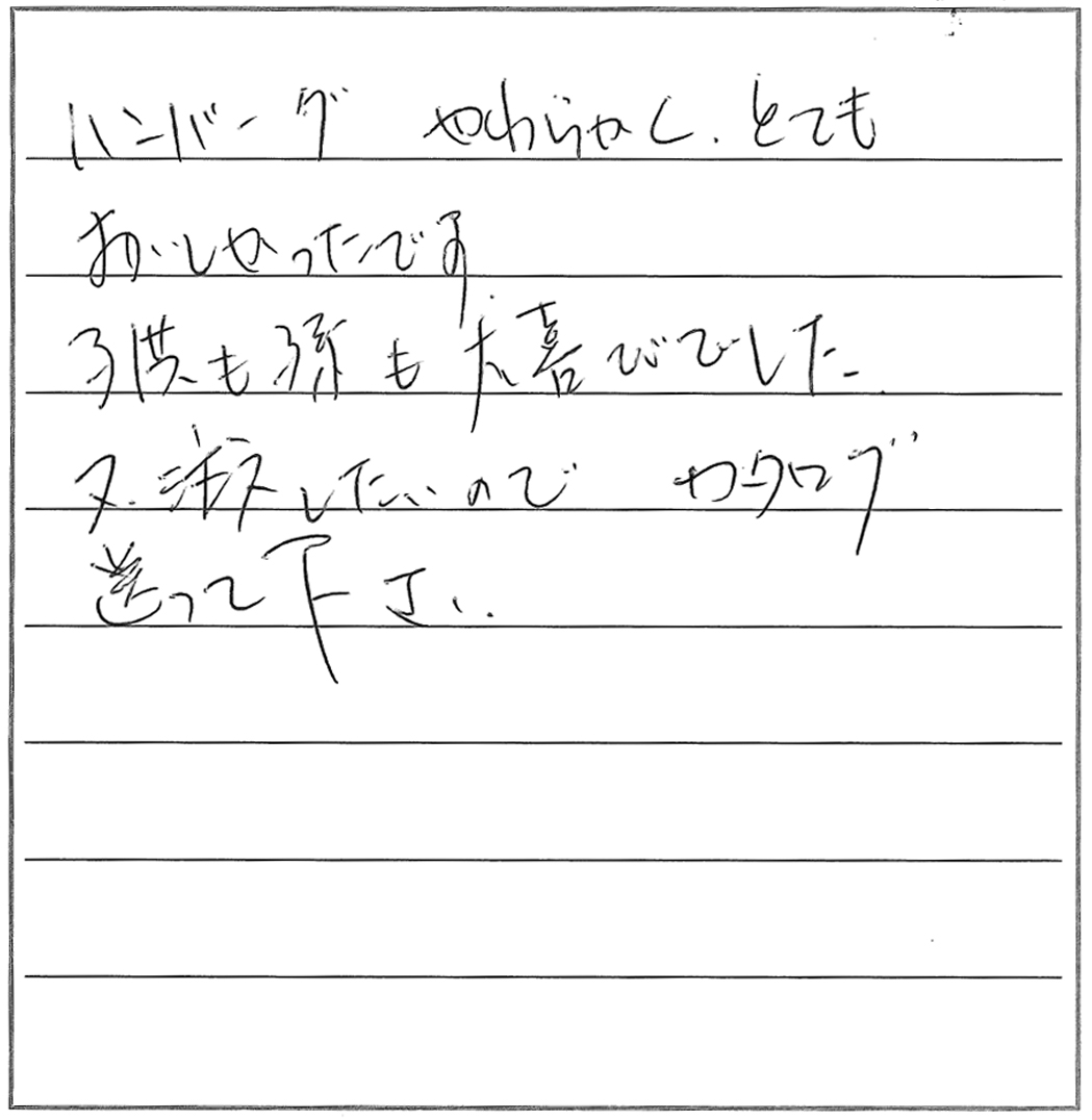 ハンバーグ、やわらかくてとてもおいしかったです。