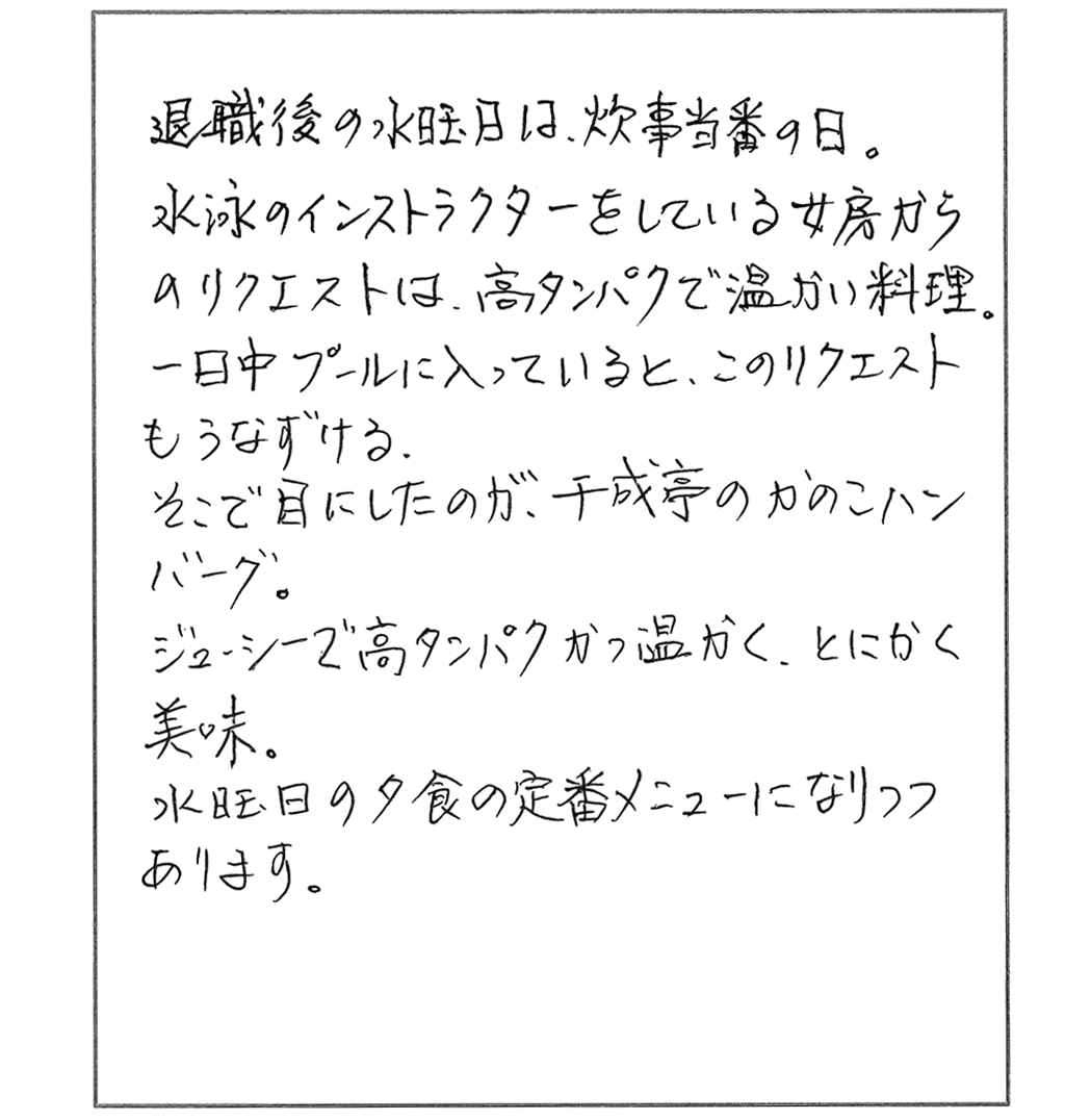 水泳のインストラクターをしている女房からのリクエストは、高タンパクで温かい料理。一日中プールに入っていると、このリクエストもうなずける。そこで目にしたのが、千成亭のかのこハンバーグ。