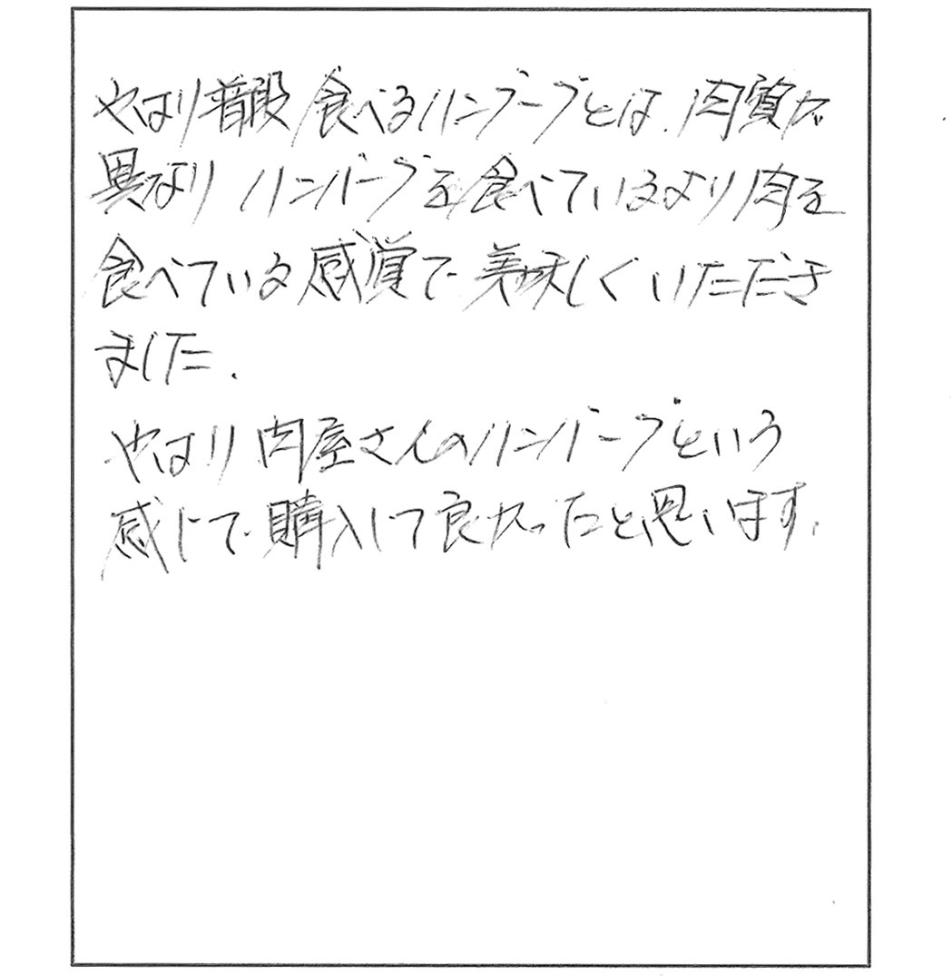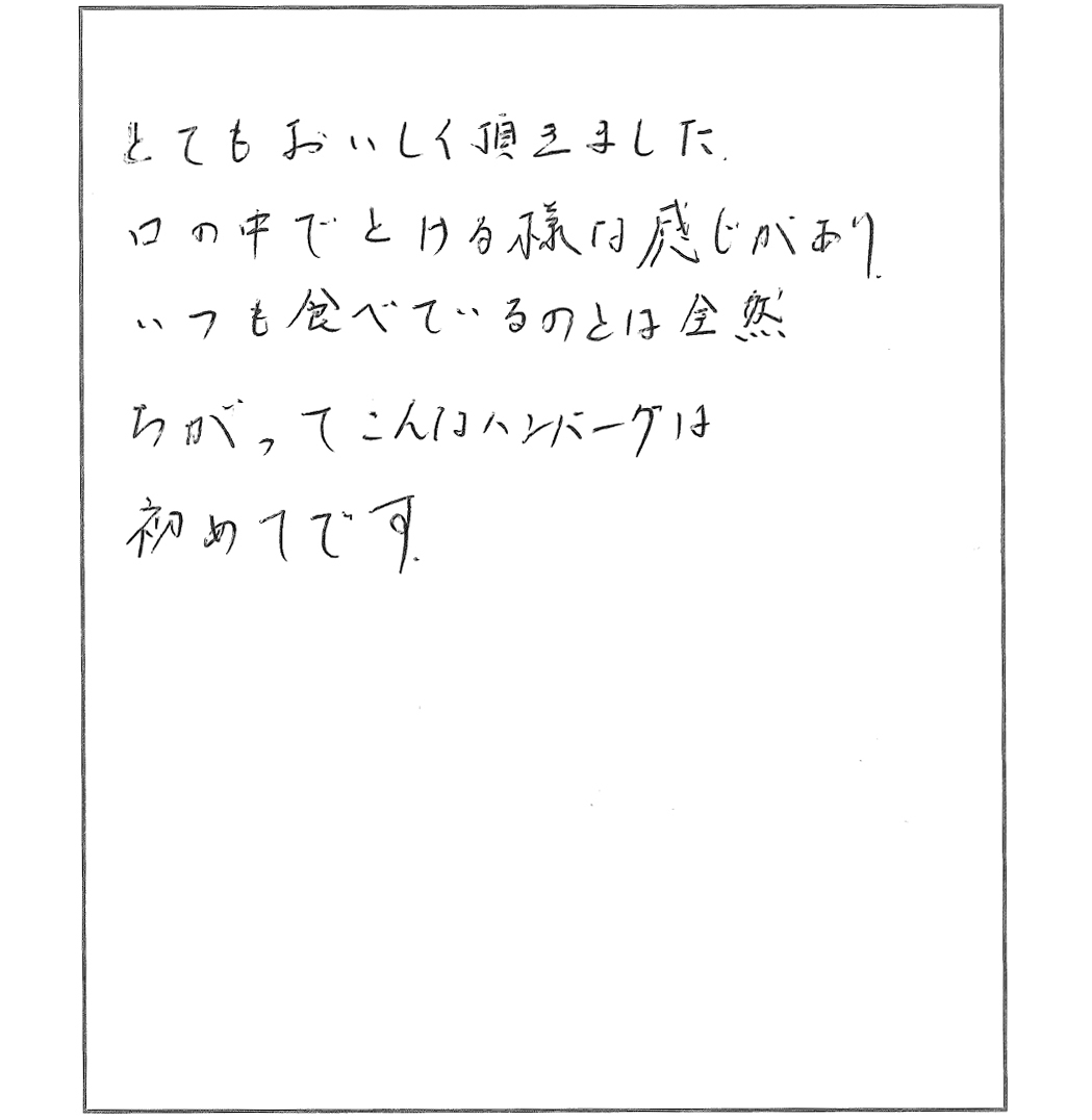 口の中でとける様な感じがあり、いつも食べているのとは全然ちがってこんなハンバーグは初めてです。