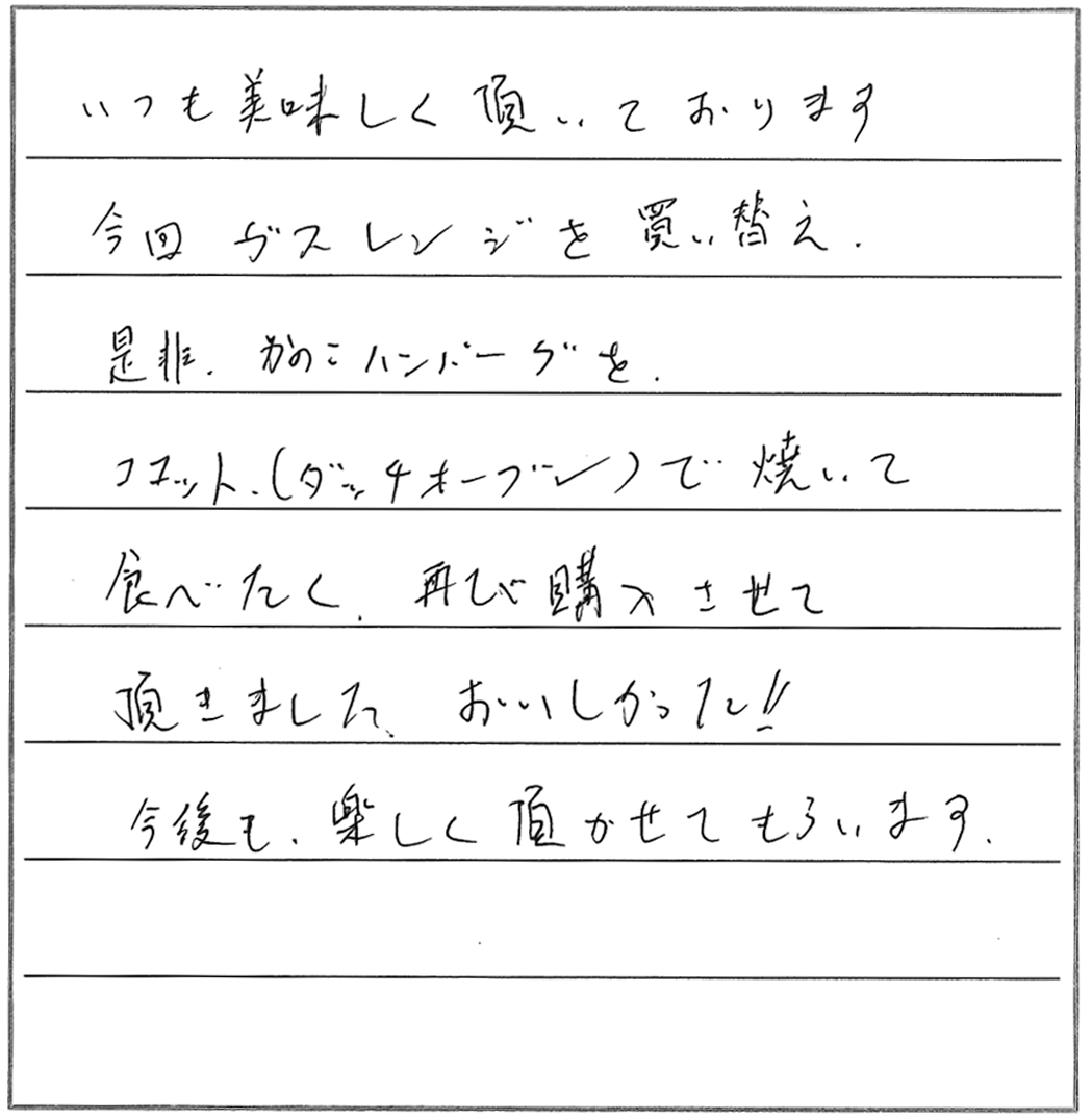 今回ガスレンジを買い替え、是非かのこハンバーグをココット(ダッチオーブン)で焼いて食べたくて、再び購入させて頂きました。