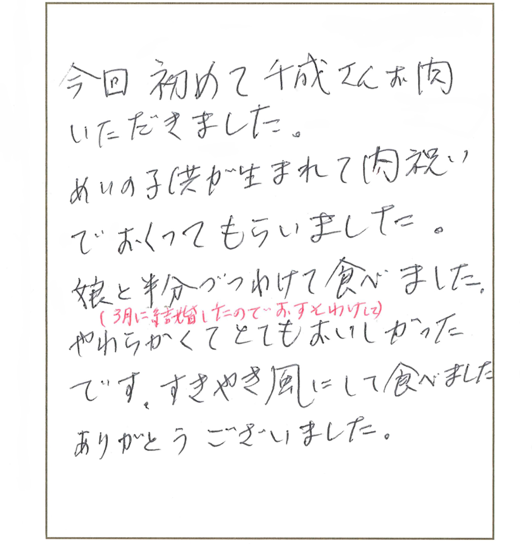 以前彦根に2年余り住んでいた娘に子供が生まれ、その子の誕生祝いの内祝いとして、おいしい千成亭さんのお肉を送っていただきました。