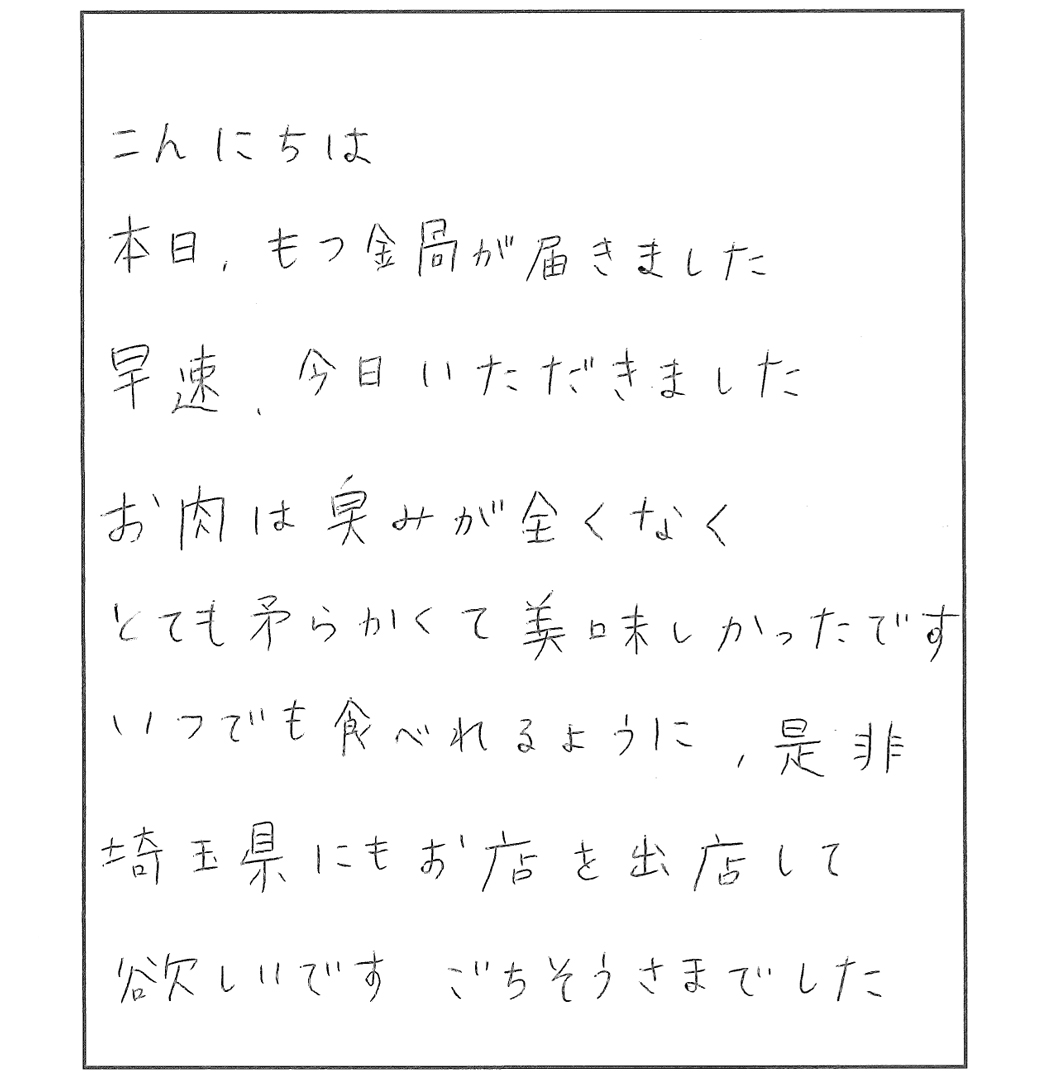 お寄せいただいた温かいお言葉、イラストに詰まった思いや、熱いメッセージが私たちの励みです。又、より良いサービスをご提供できるよう、そして、ご満足いただけるお肉をご提供できるよう努めてまいります。又、内容は随時更新していきます。皆様からのお手紙、お待ちいたしております。