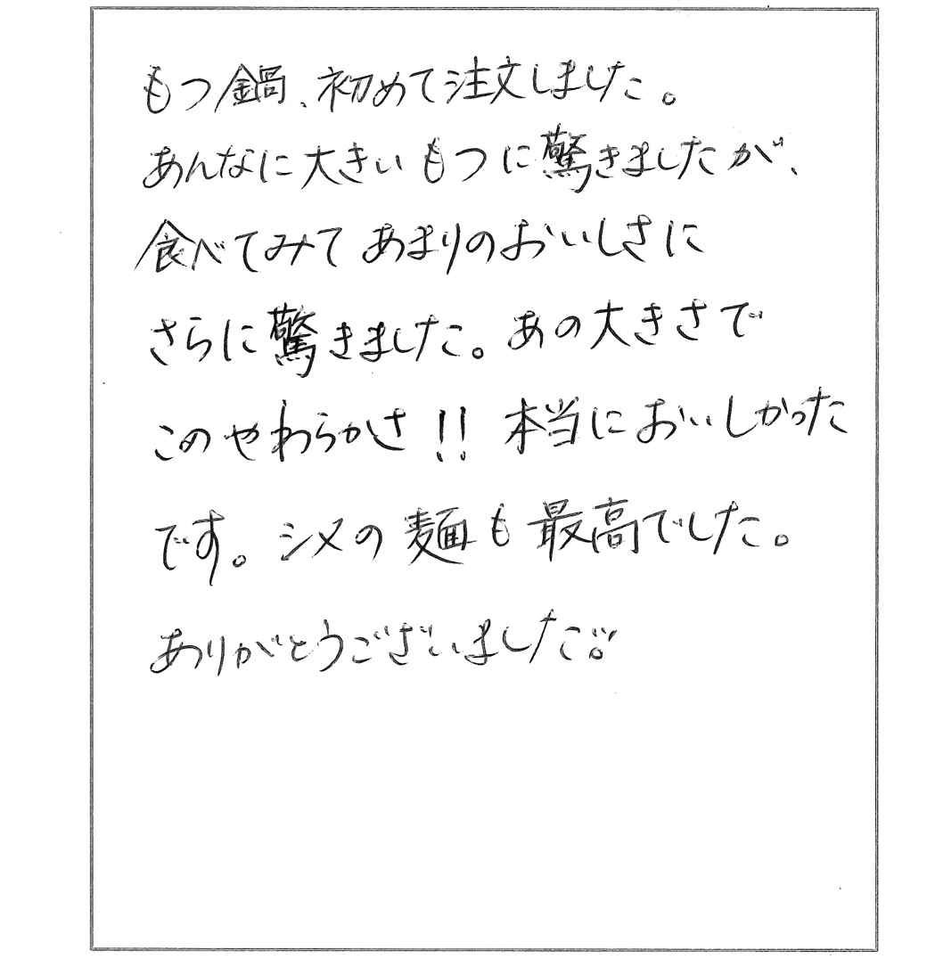 あんなに大きいもつに驚きましたが、食べてみてあまりのおいしさにさらに驚きました。