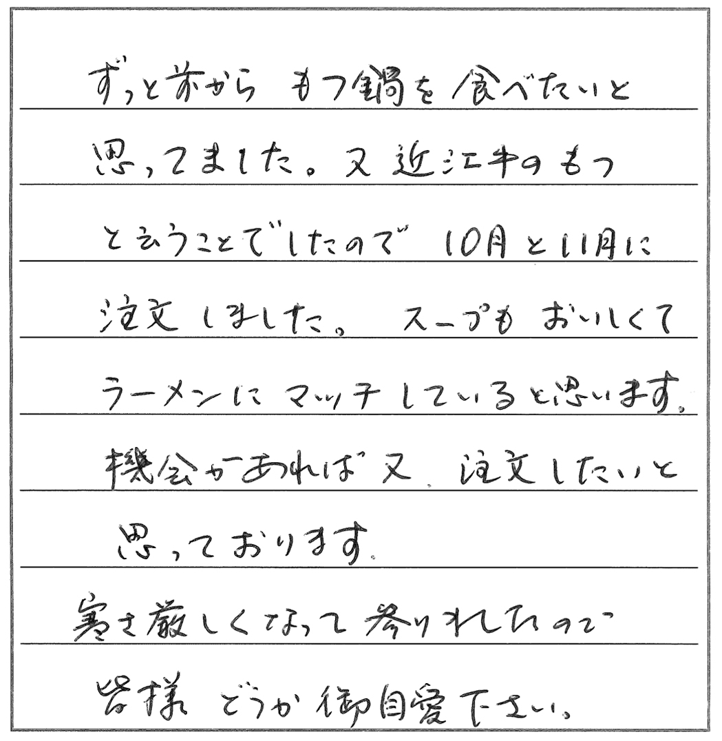 ずっと前から、もつ鍋を食べたいと思っていました。又、近江牛のもつと云うことでしたので10月と11月に注文しました。