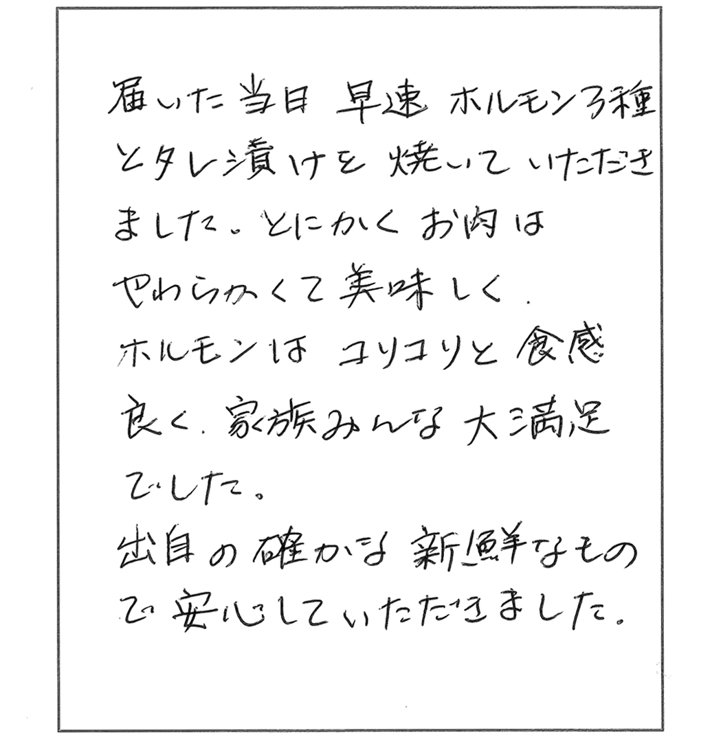 とにかくお肉はやわらかくて美味しく、ホルモンはコリコリと食感良く、家族みんなで大満足でした。