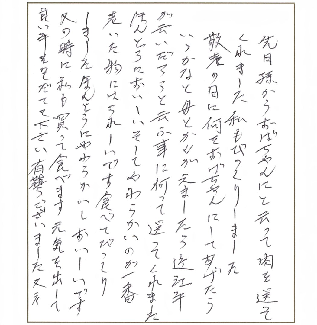 先日孫からおばあちゃんにと云って肉を送ってくれました。私もびっくりしました。