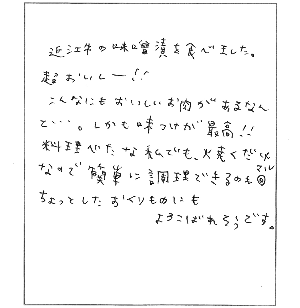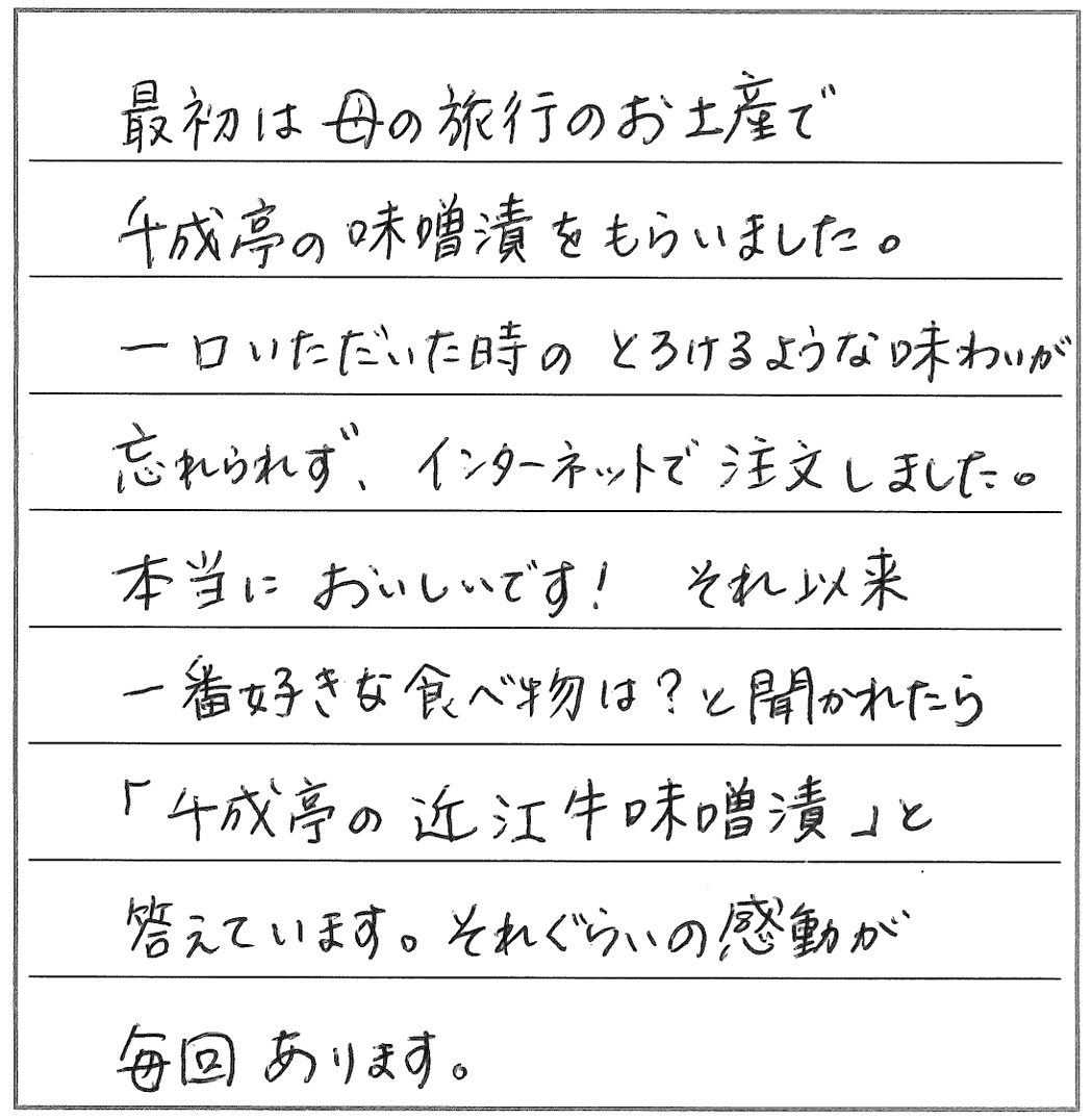 滋賀の近江牛専門店・近江牛ステーキ【千成亭】 HOME > お客様からの喜びのお声・口コミー味噌漬け編