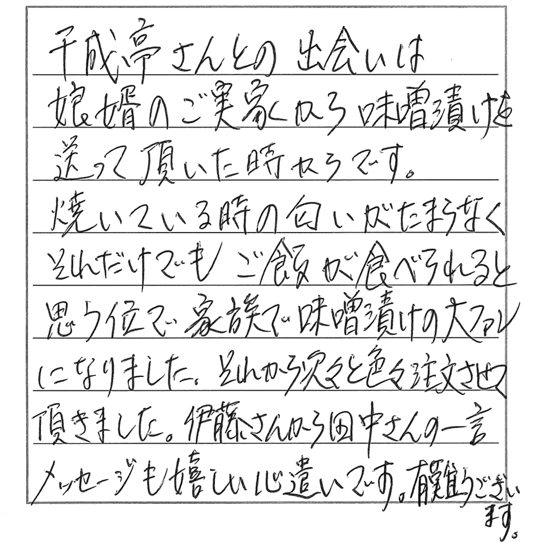 千成亭さんとの出会いは娘婿のご実家から味噌漬けを送って頂いた時からです。