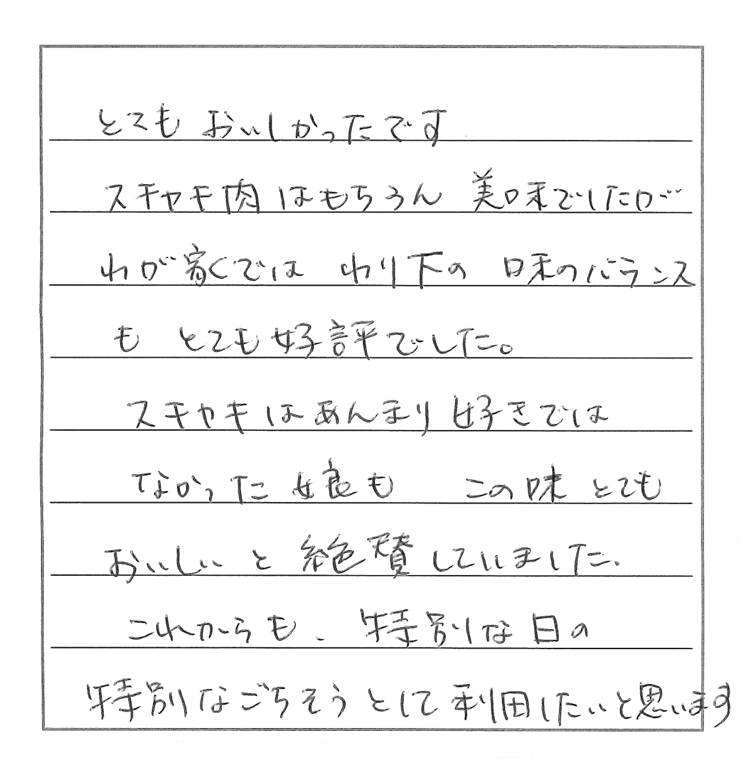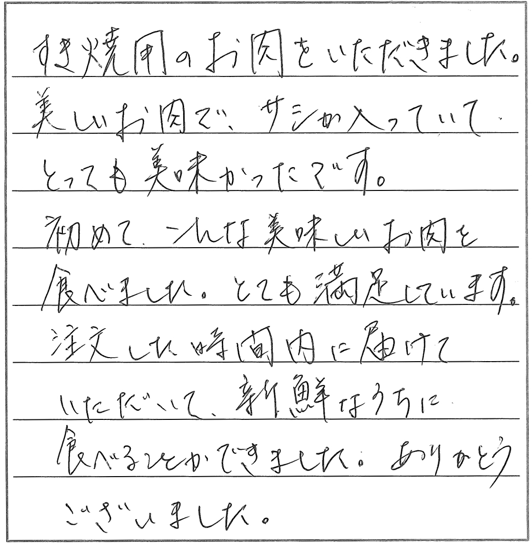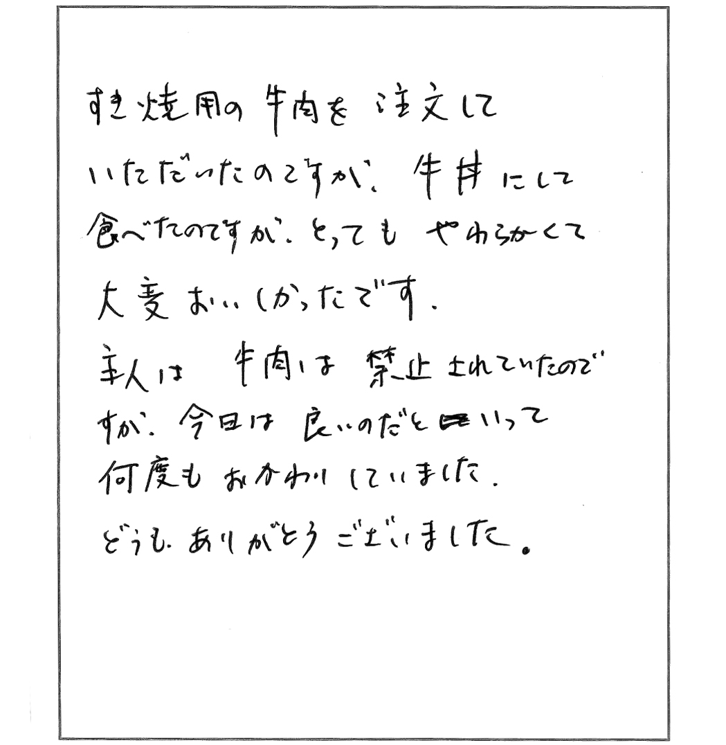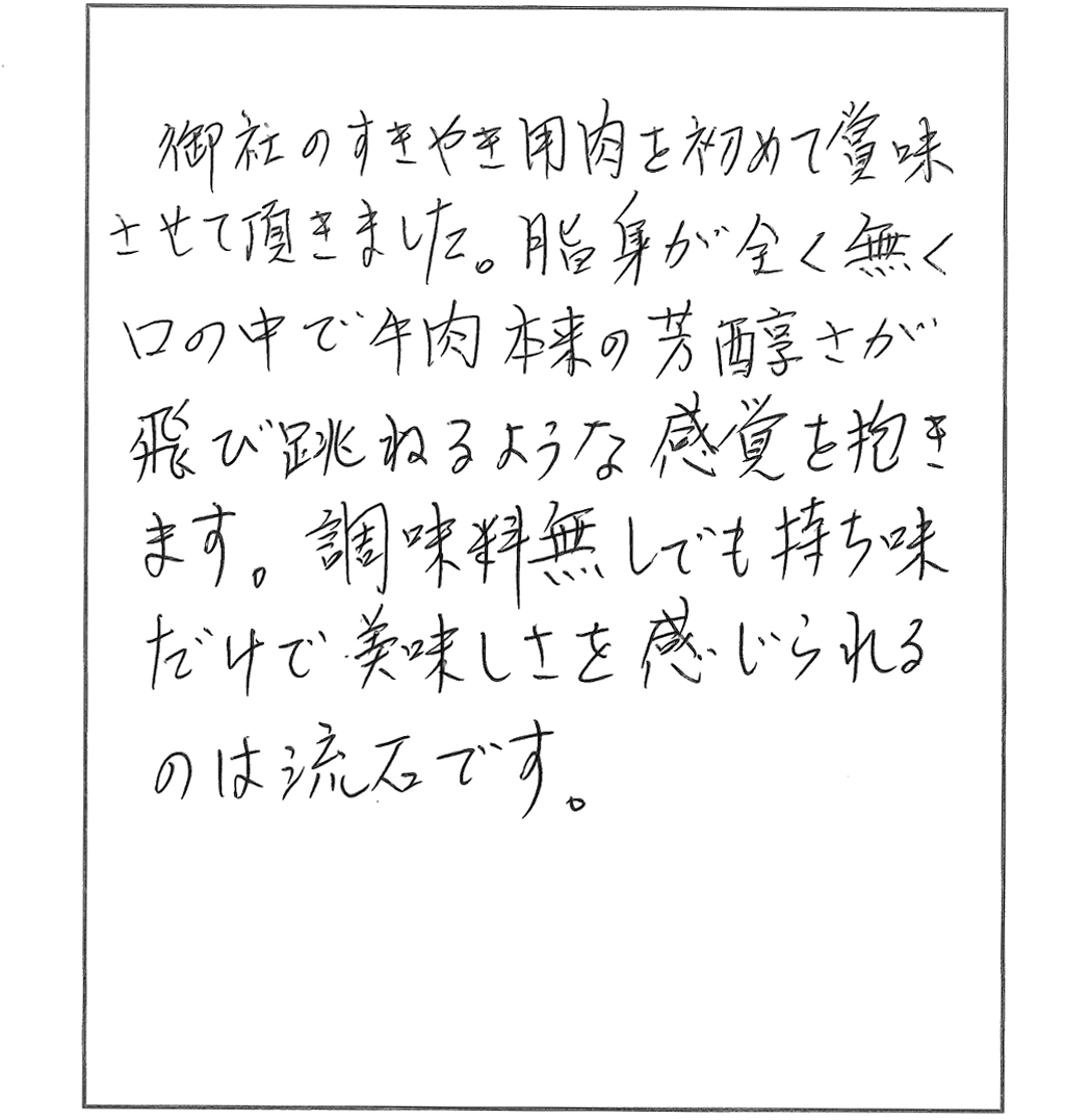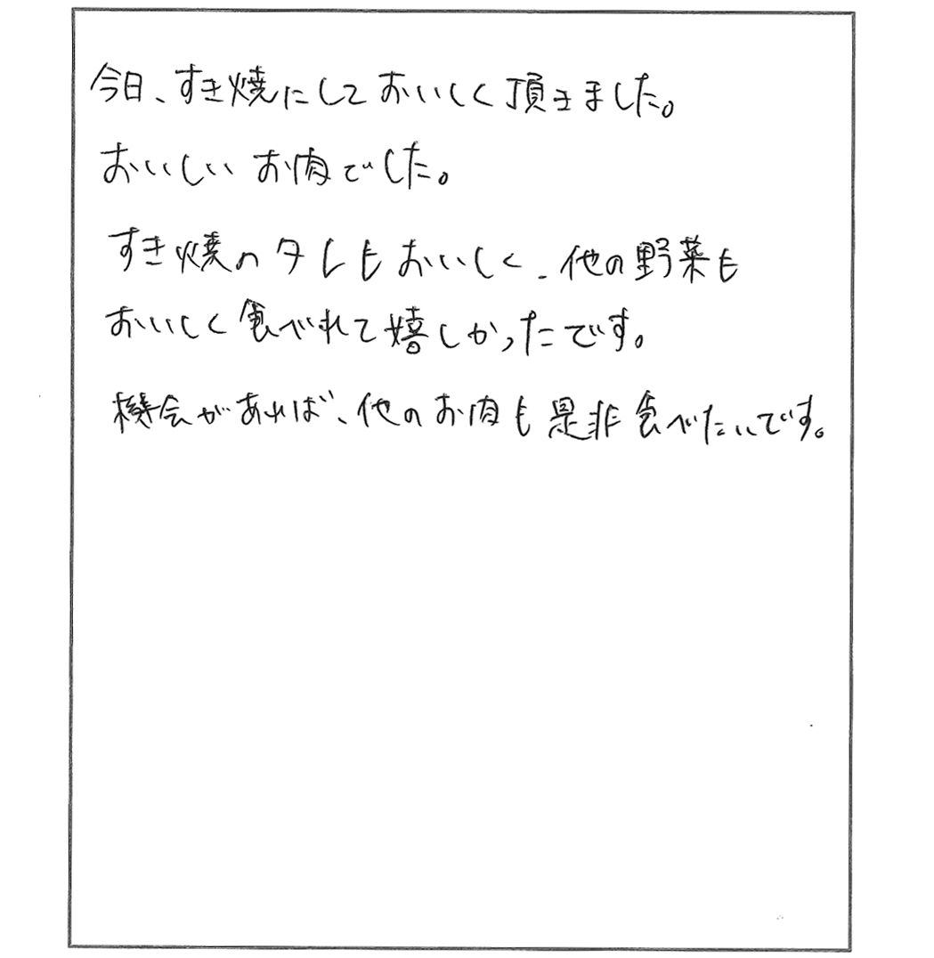 久々にすきやきをおいしくいただきました。脂の多い肉は苦手で、また焼き肉など脂っこく、味の濃い料理も好まないのですが、貴店のお肉は肉質が良く、脂も適量で、満足していただくことができました。