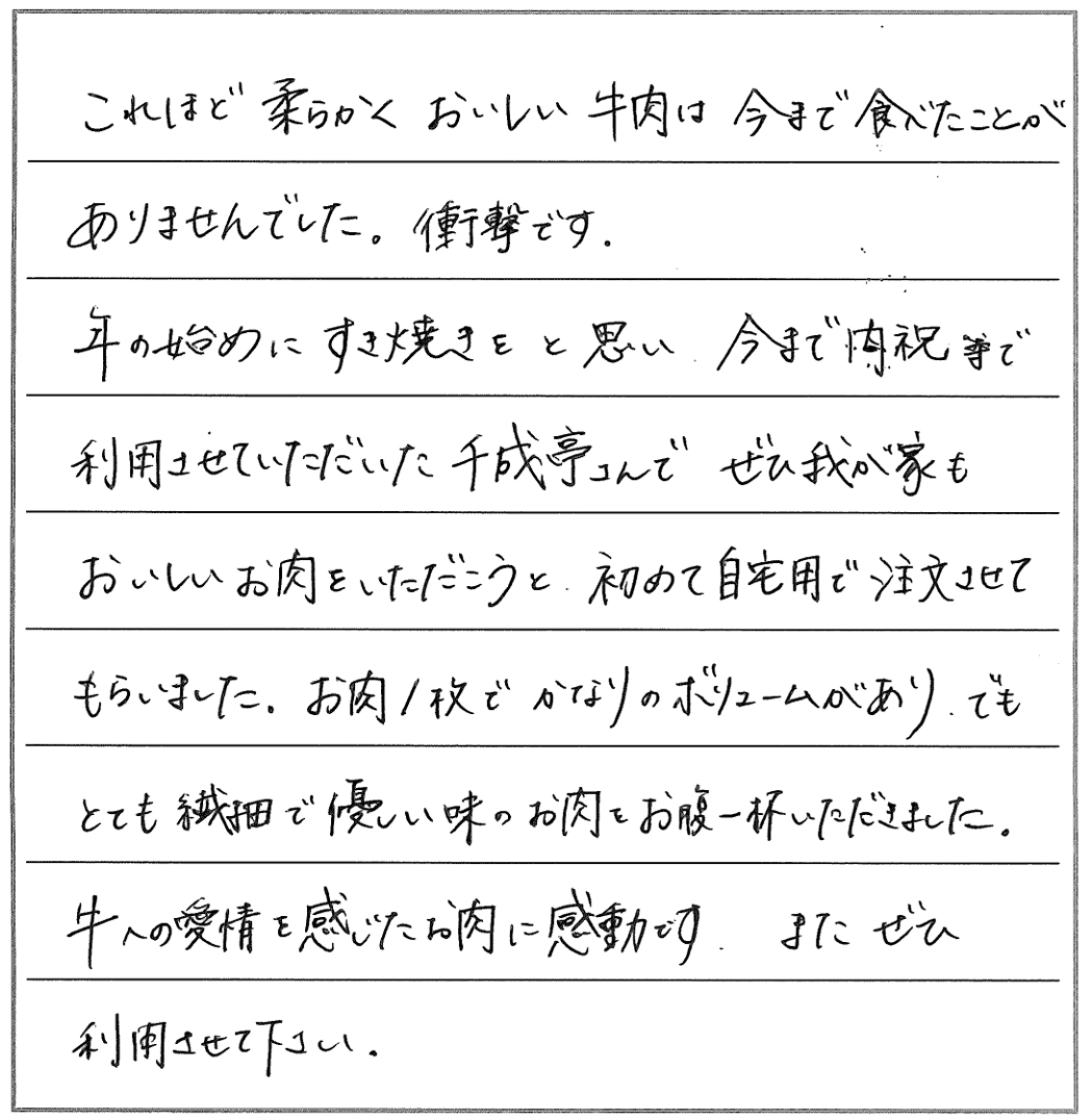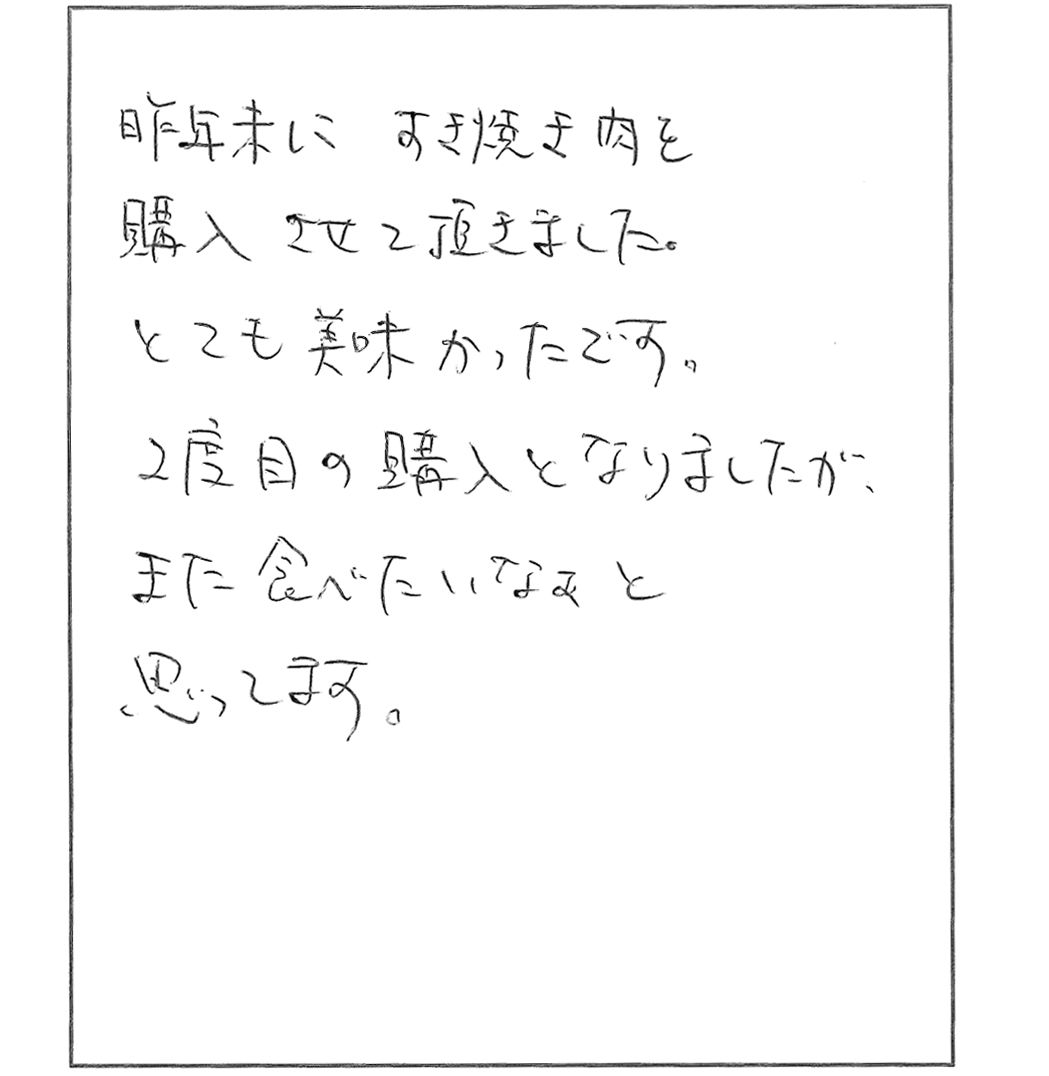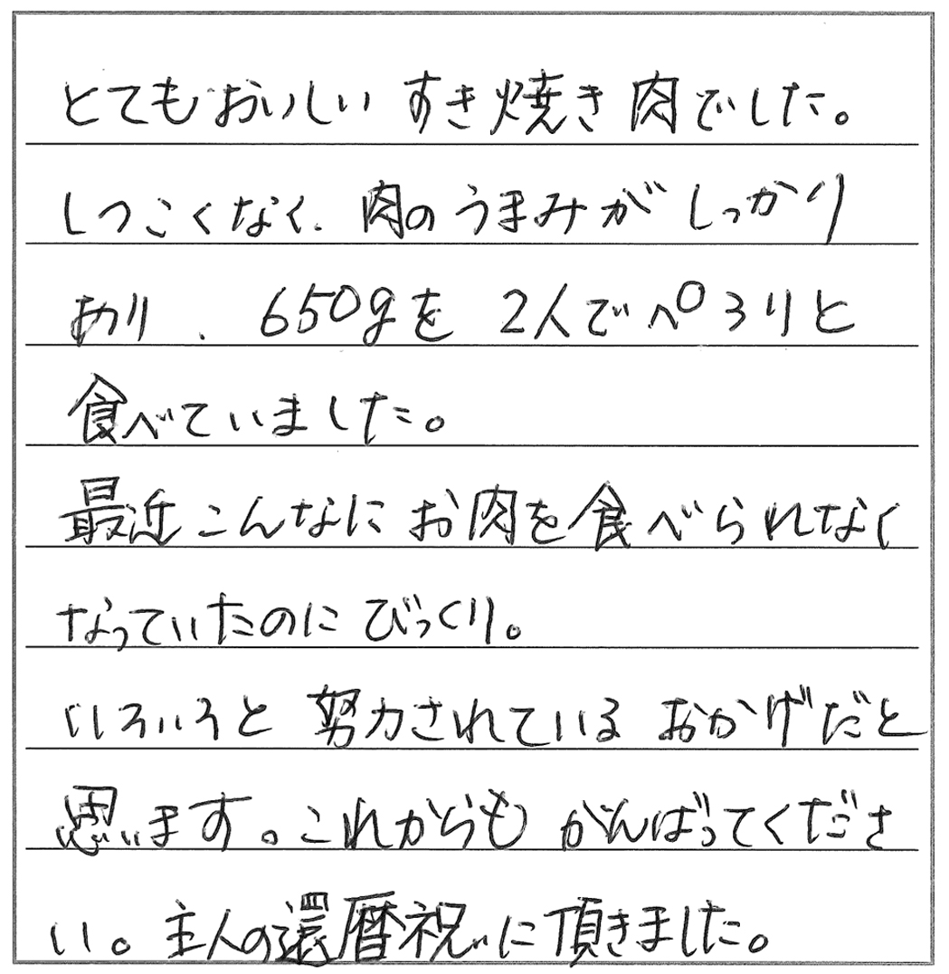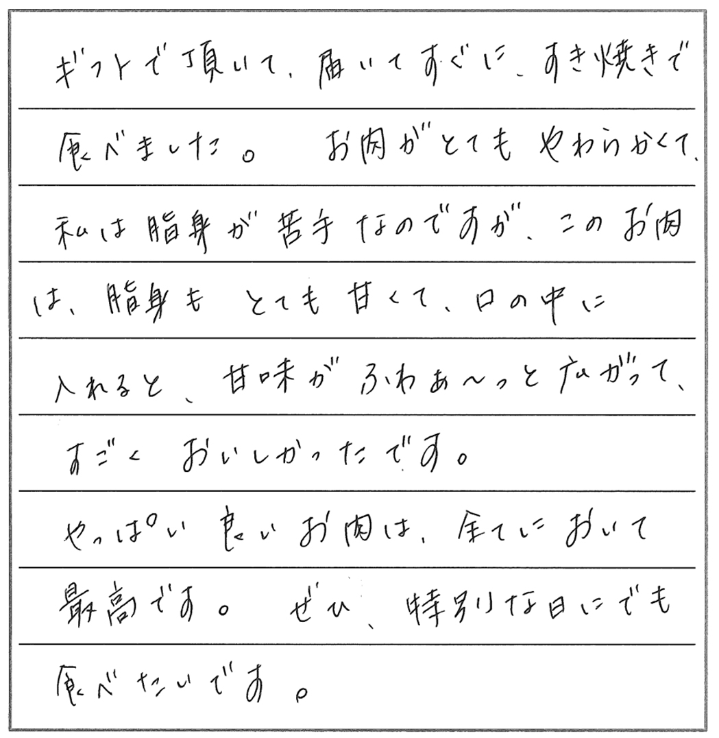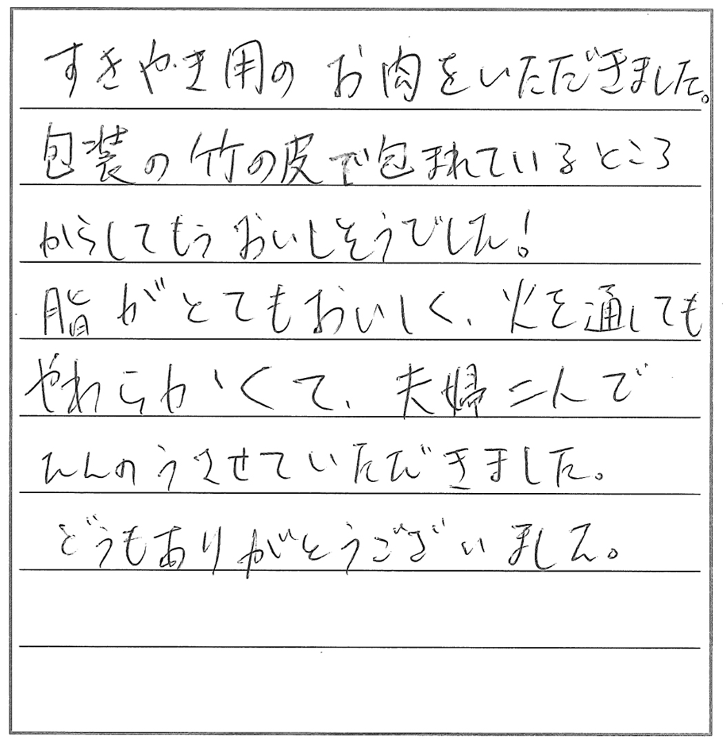 久々にすきやきをおいしくいただきました。脂の多い肉は苦手で、また焼き肉など脂っこく、味の濃い料理も好まないのですが、貴店のお肉は肉質が良く、脂も適量で、満足していただくことができました。