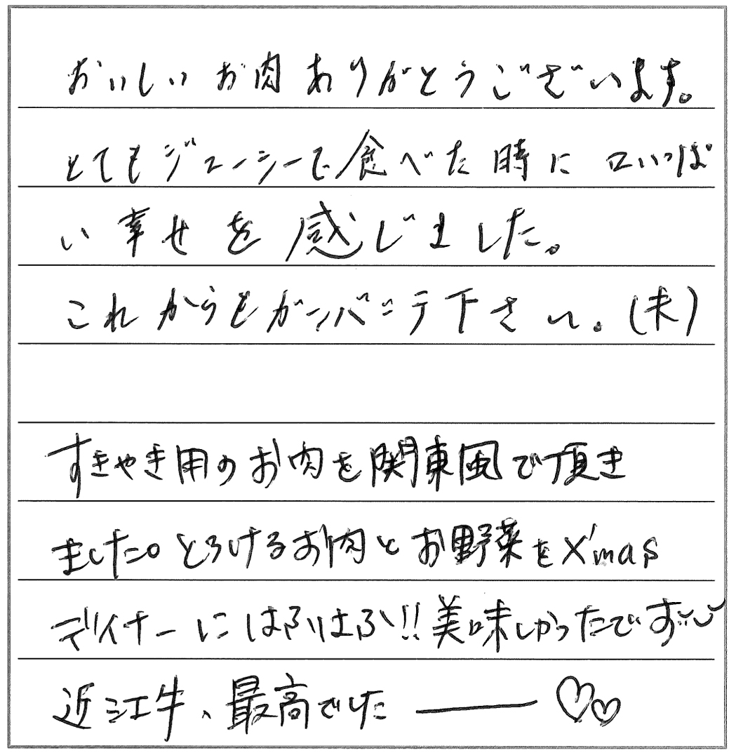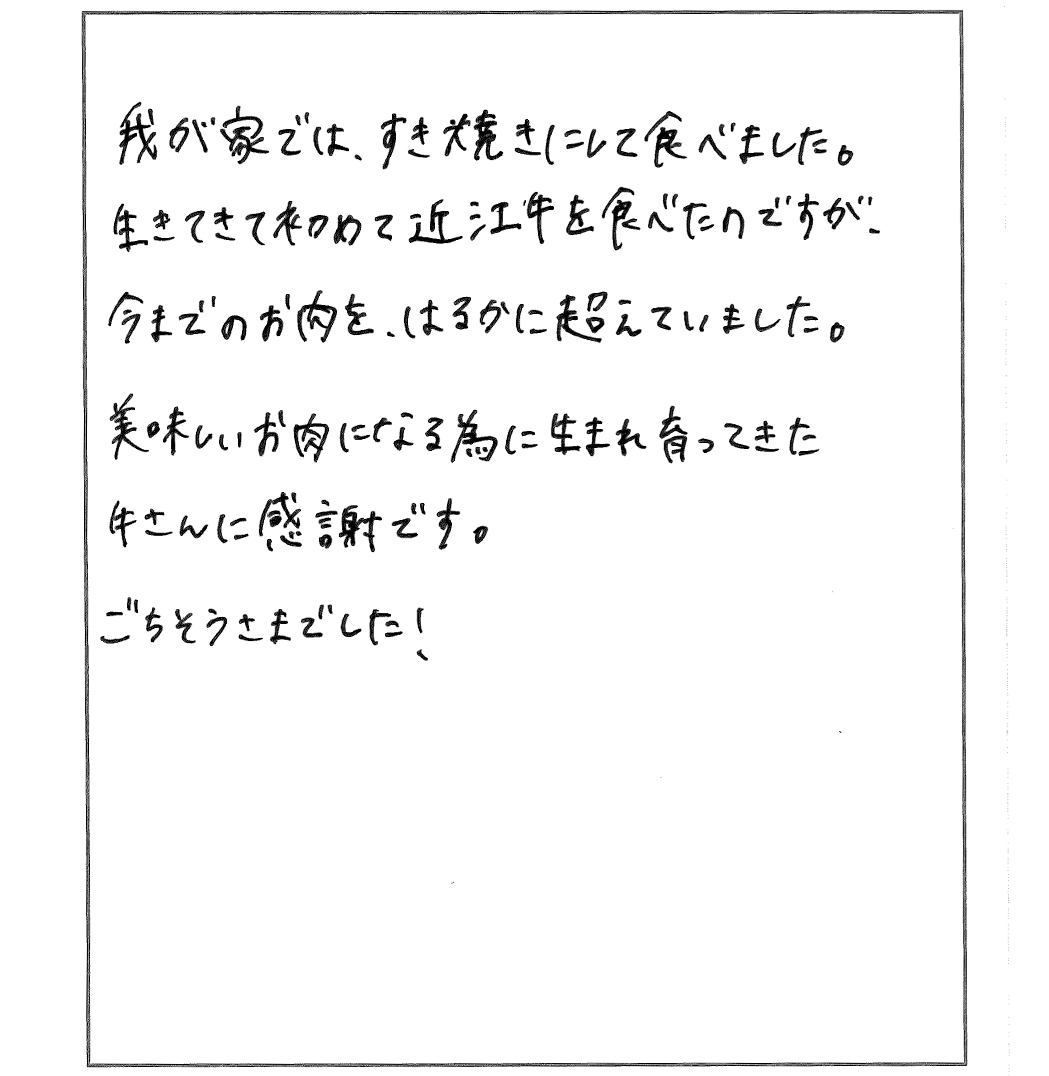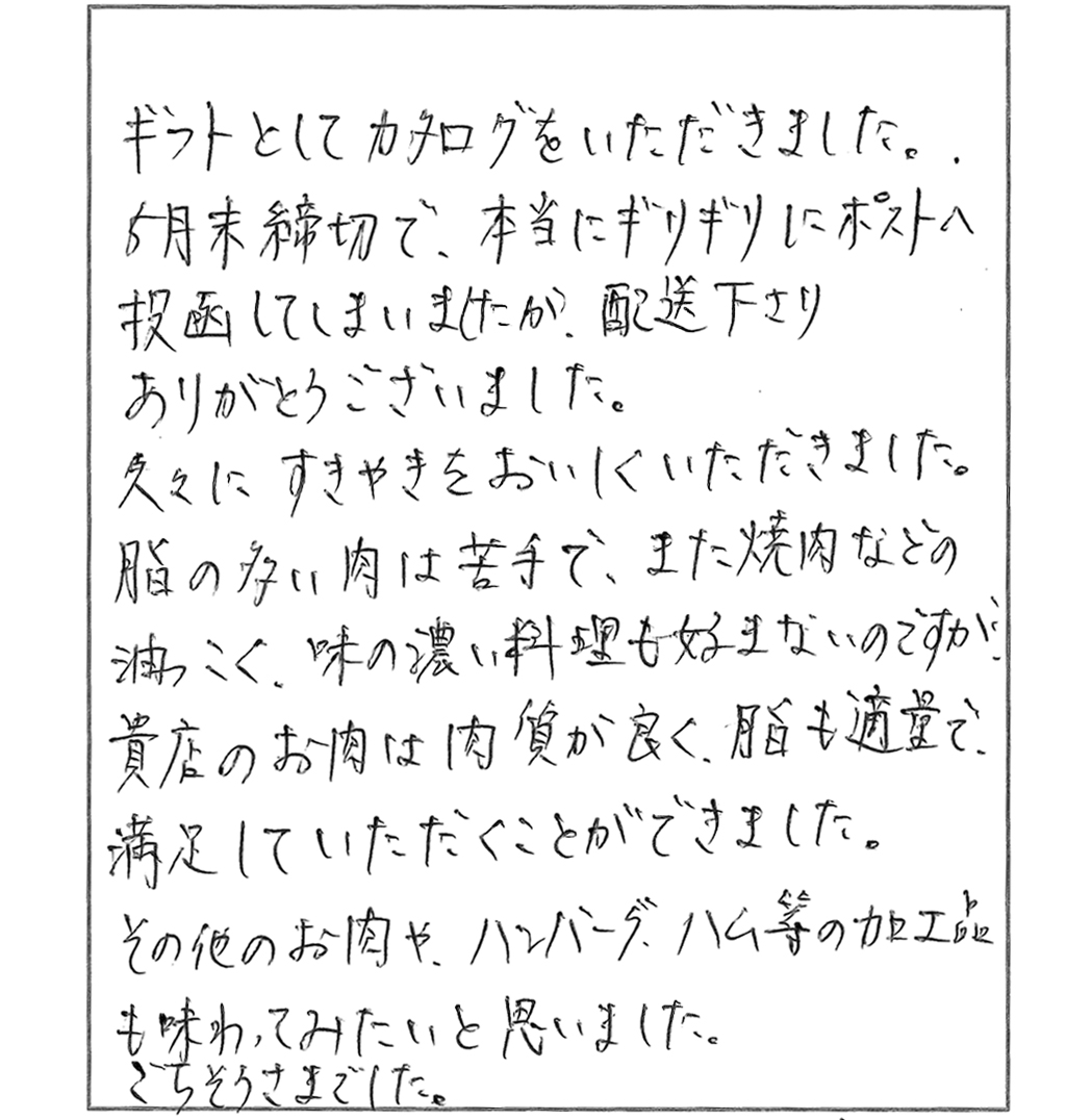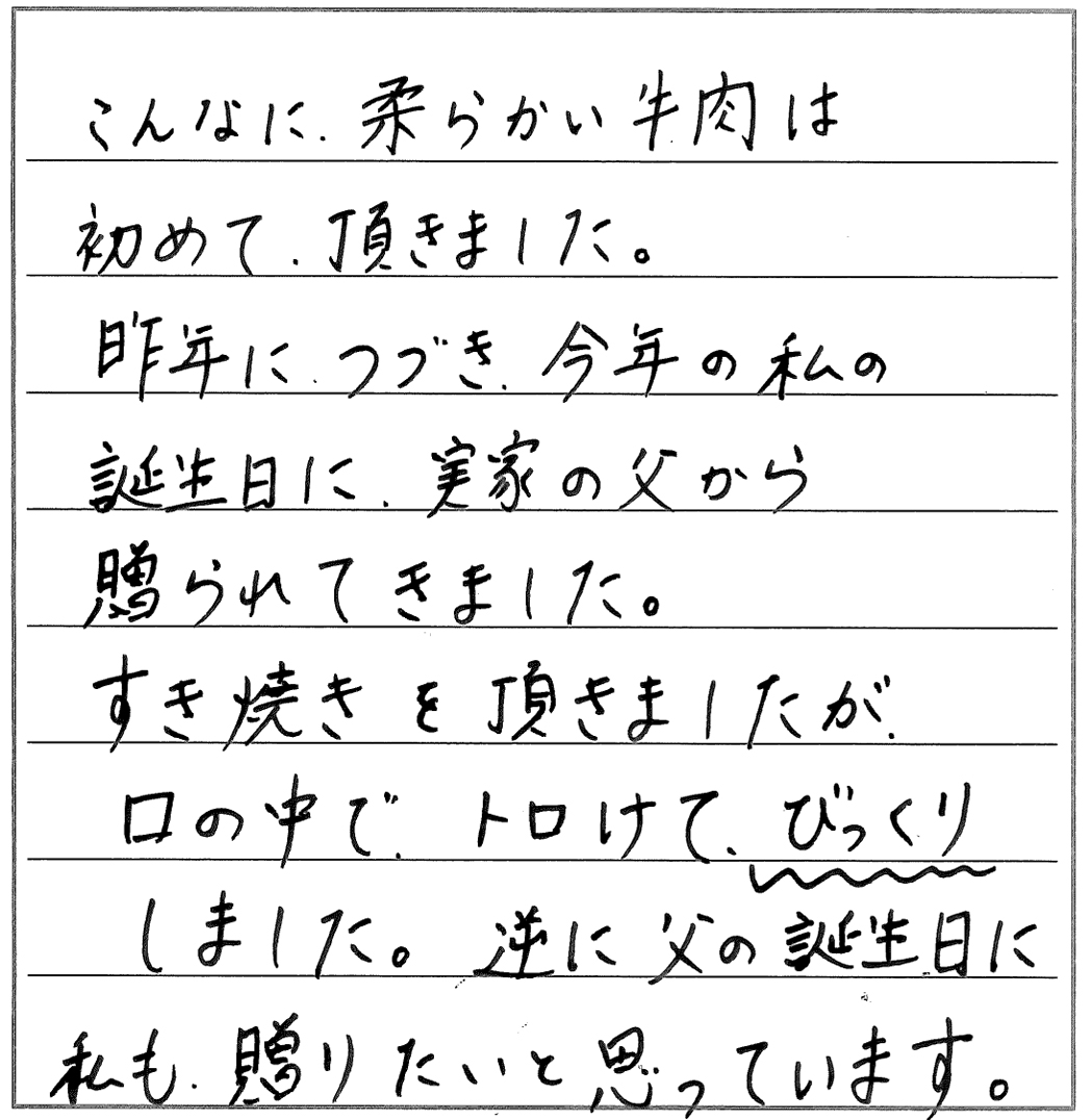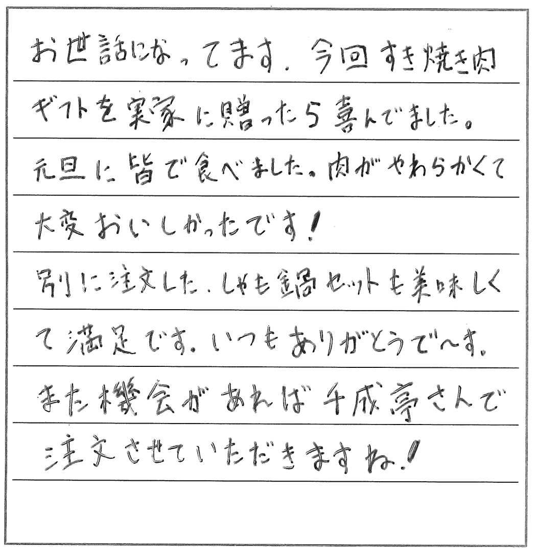 久々にすきやきをおいしくいただきました。脂の多い肉は苦手で、また焼き肉など脂っこく、味の濃い料理も好まないのですが、貴店のお肉は肉質が良く、脂も適量で、満足していただくことができました。