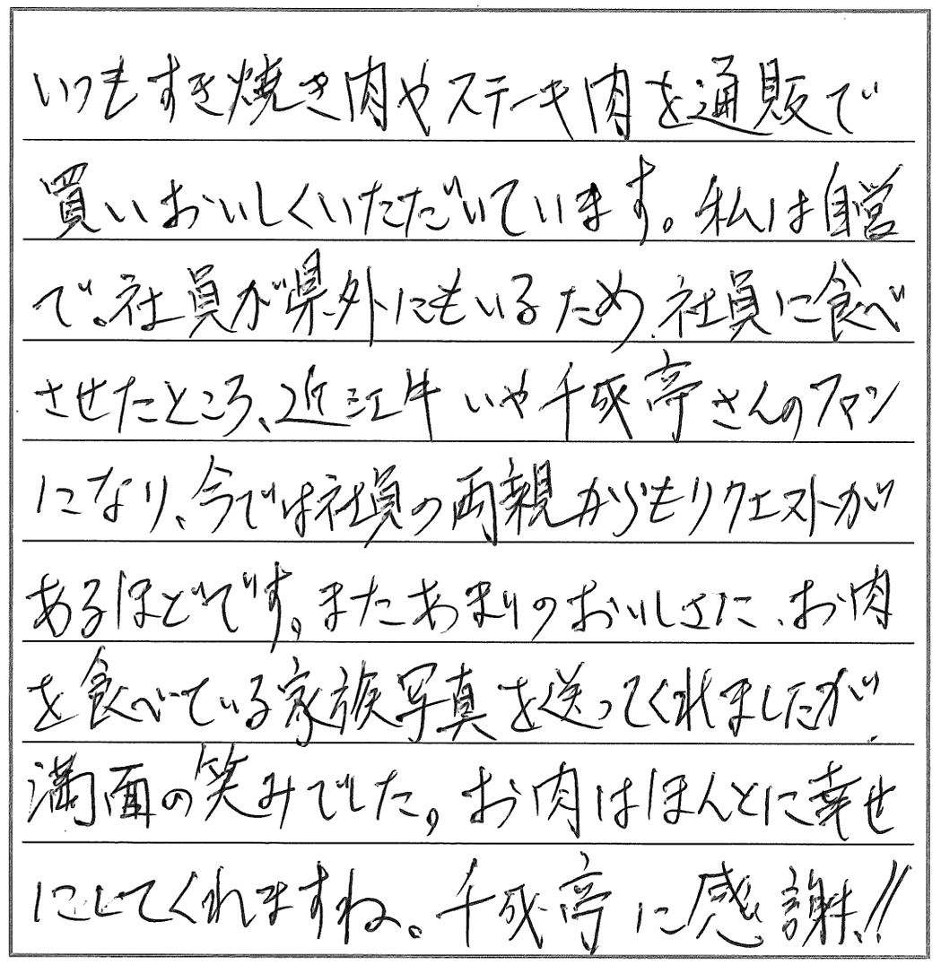 私は自衛で、社員が県外にもいるため、社員に食べさせたところ、近江牛いや千成亭さんのファンになり、いまでは社員の両親からもリクエストがあるほどです。