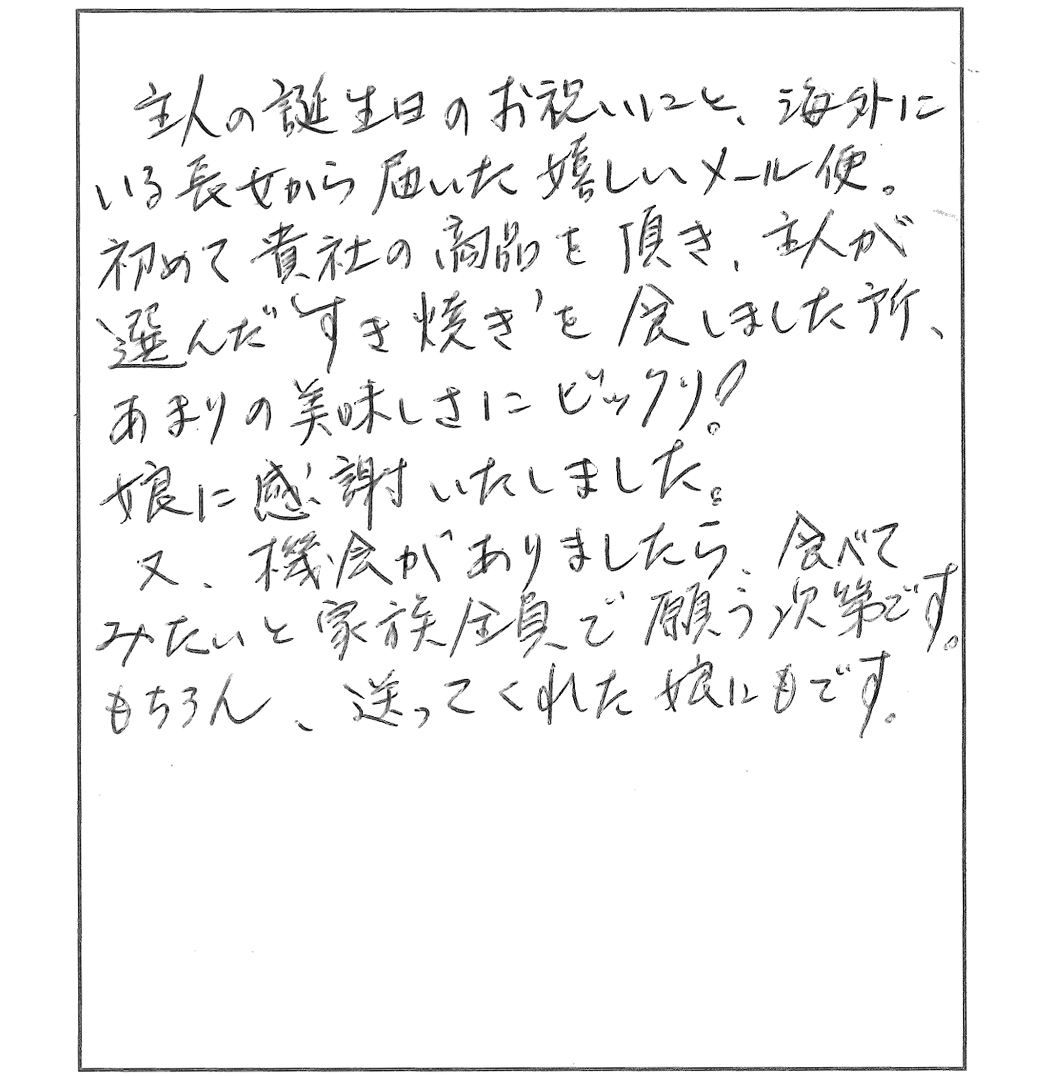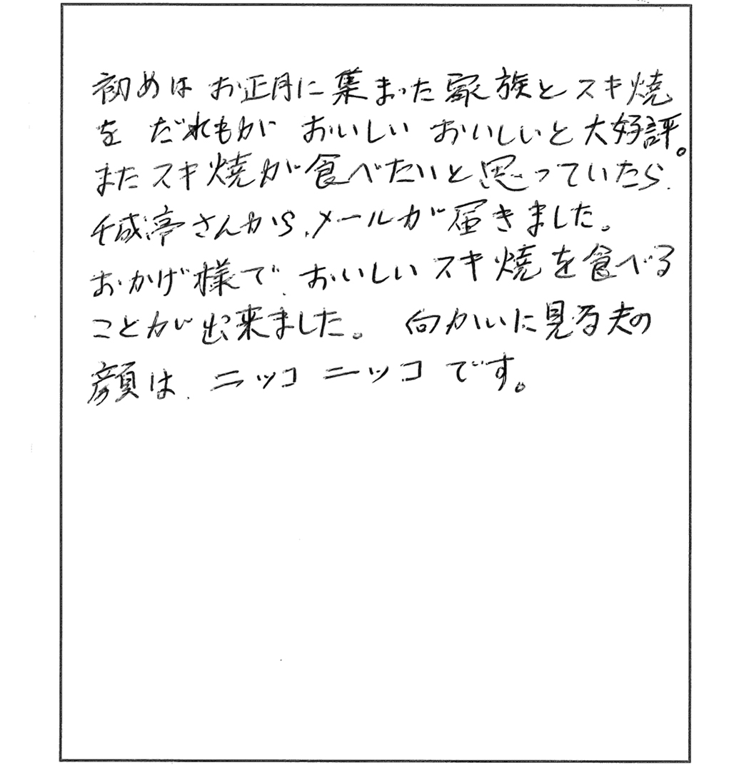 初めて貴社の商品を頂き、主人が選んだ’すき焼き’を食しました所、あまりの美味しさにビックリ!娘に感謝いたしました。