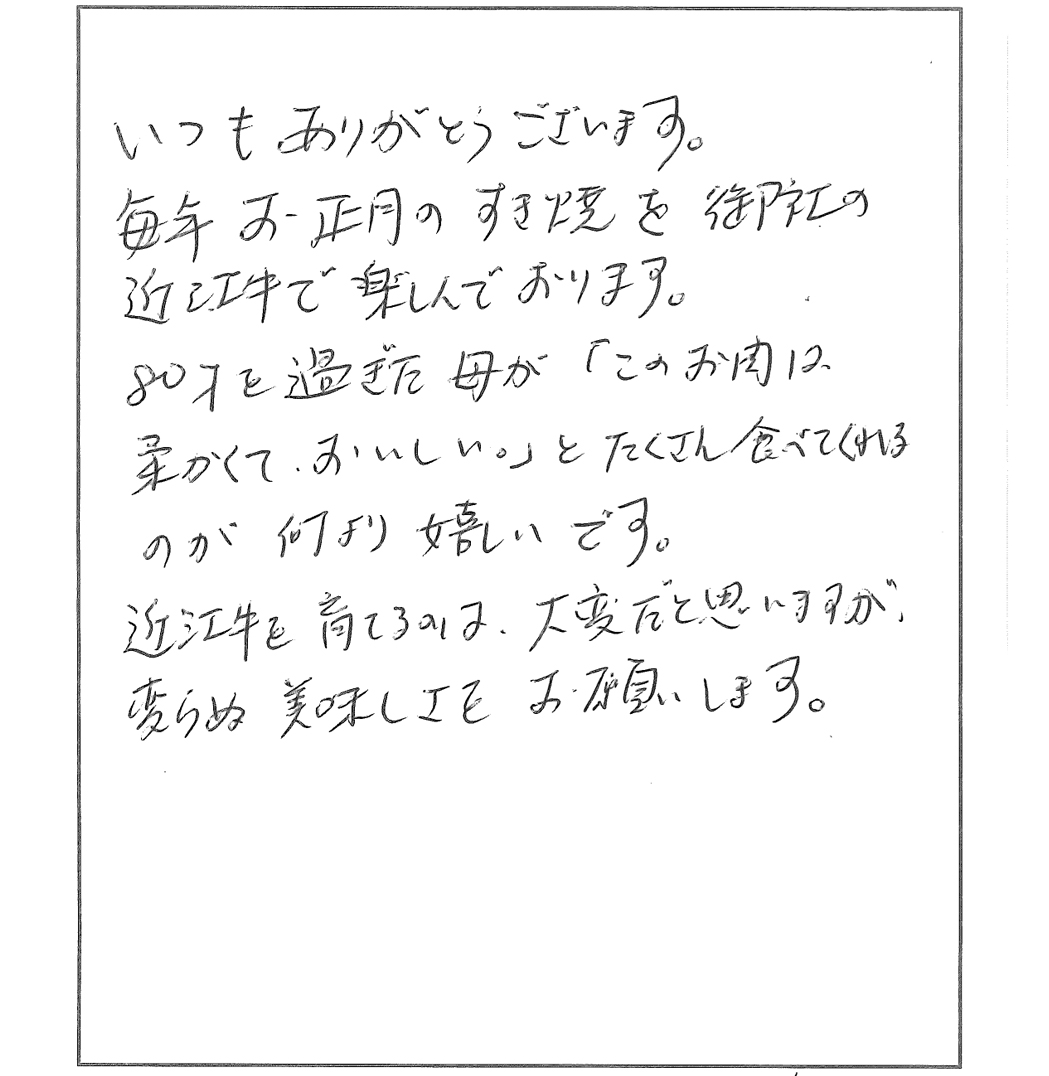近江牛を育てるのは、大変だと思いますが、変わらぬ美味しさをお願いします。