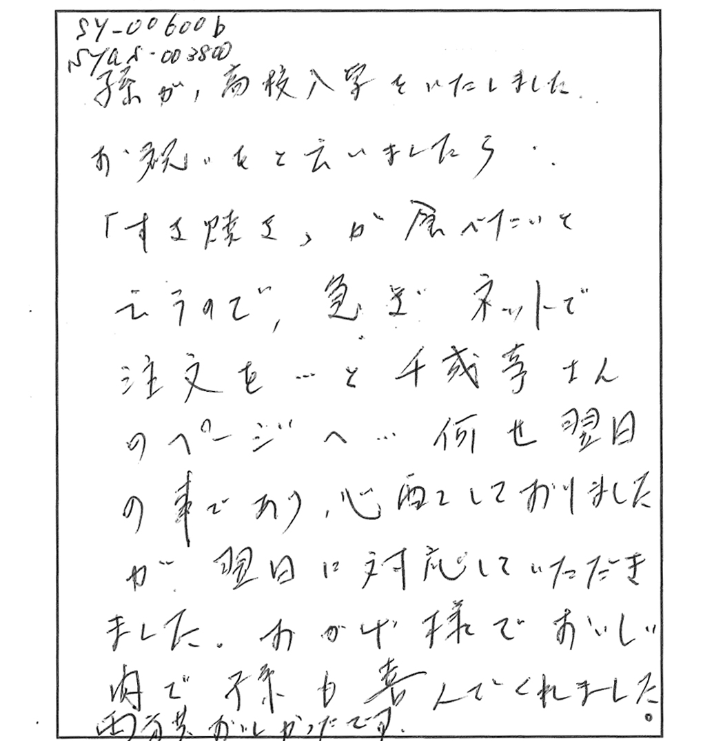 と、千成亭さんのページへ…。何せ翌日の事であり、心配しておりましたが、翌日に対応していただきました。