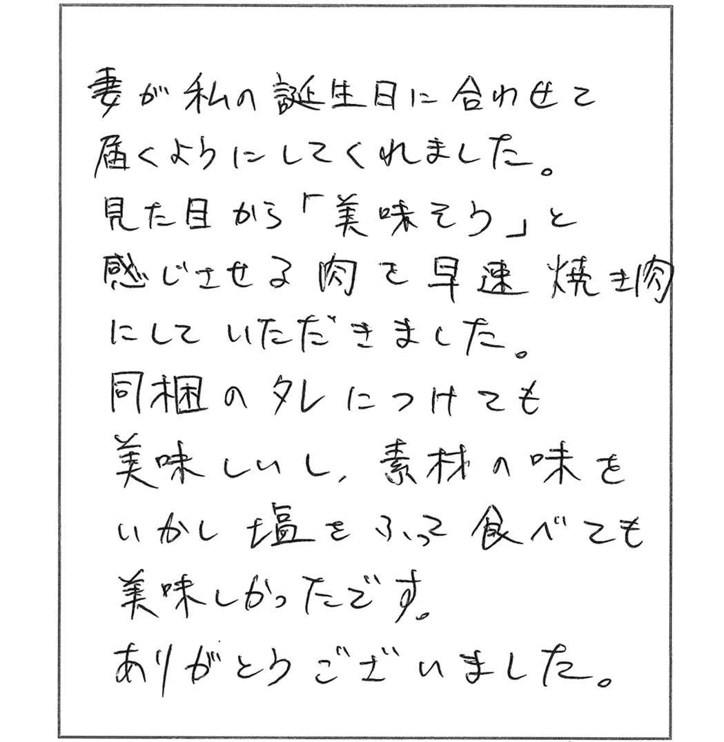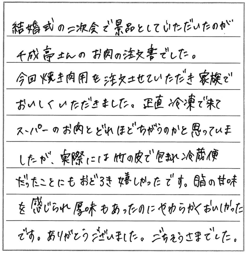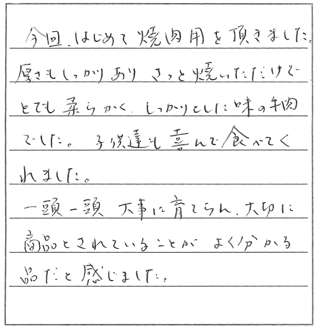 今回焼き肉用を注文させていただき家族でおいしくいただきました。正直冷凍で来てスーパーのお肉とどれほどちがうのかと思っていましたが、実際には竹の皮で包まれ冷蔵便だったことにもおどろき嬉しかったです。