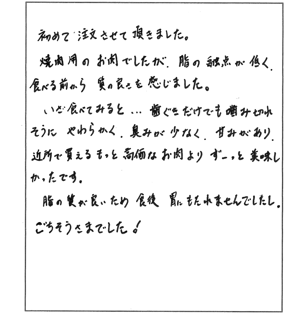 初めて注文させて頂きました。焼肉用のお肉でしたが、脂の融点が低く、食べる前から質の良さを感じました。