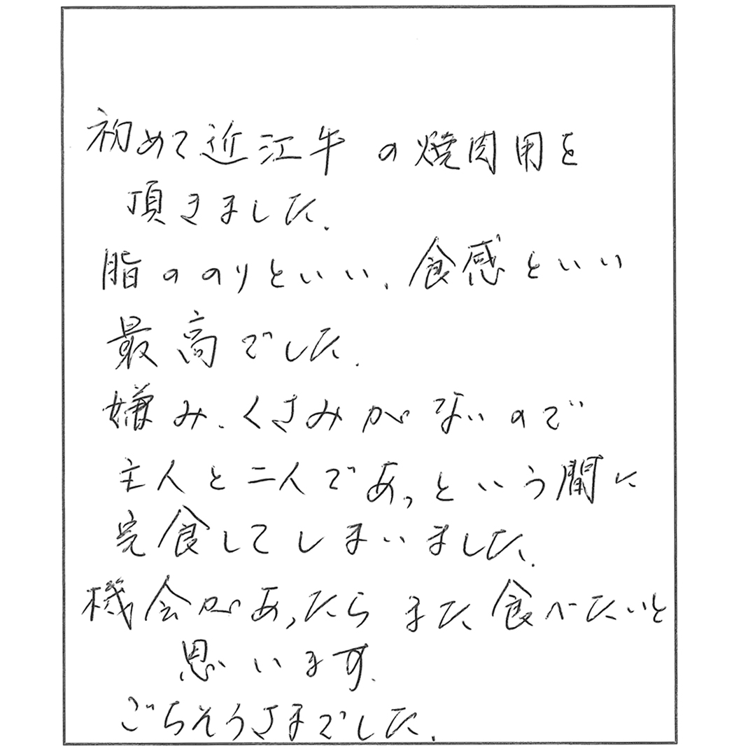 初めて近江牛の焼肉用を頂きました。脂ののりといい食感といい最高でした。