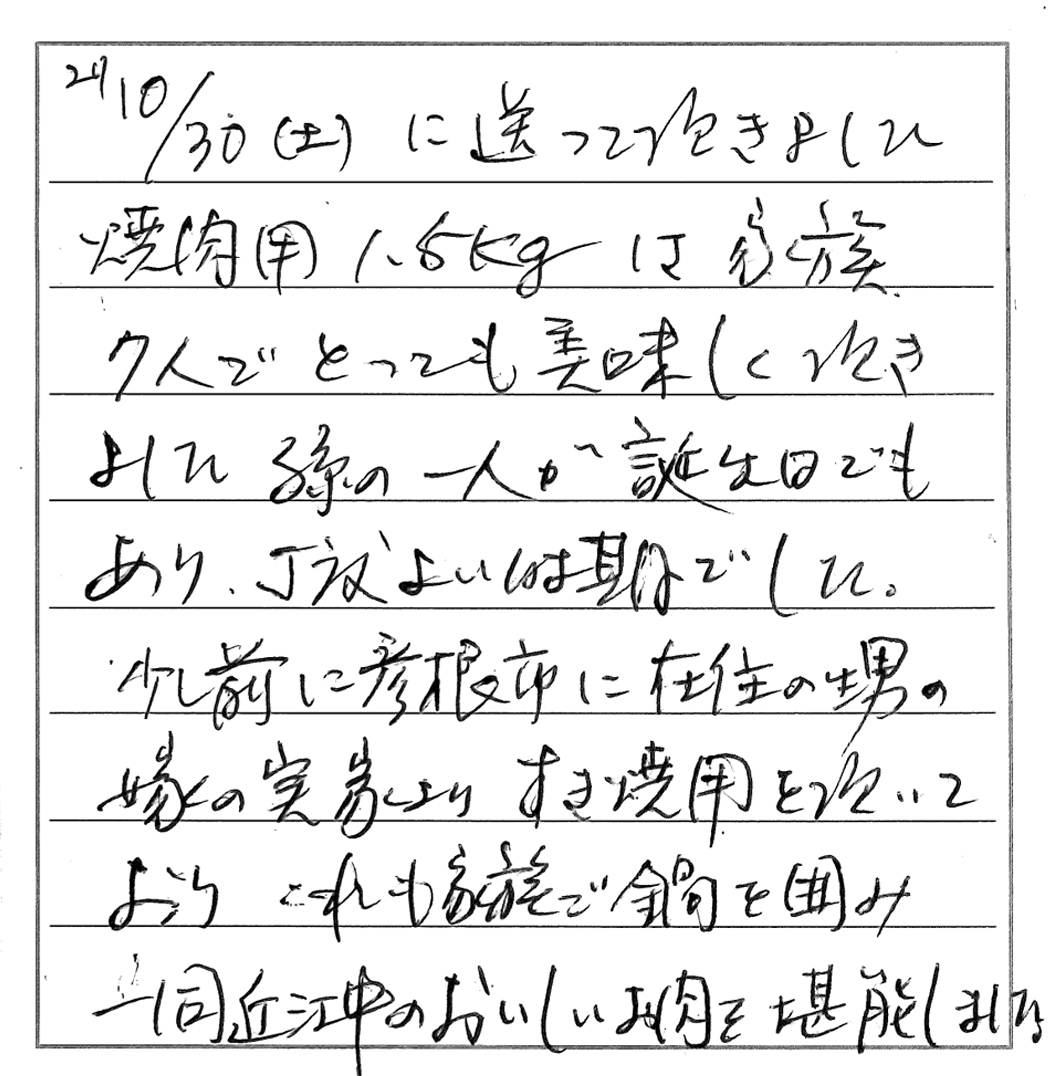 10月30日に送って頂きました焼肉用1.5kgは家族7人でとってもおいしく頂きました。