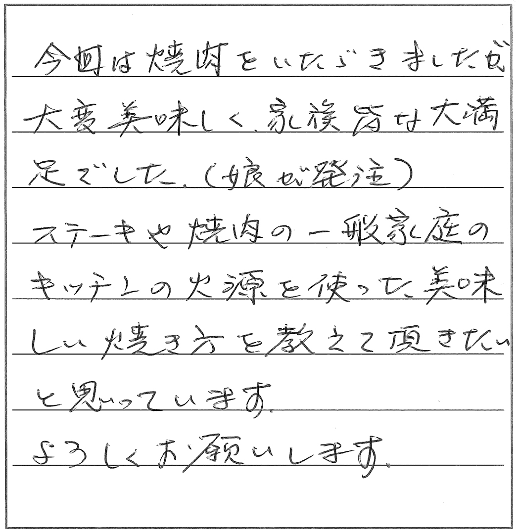 今回は焼肉をいただきましたが、大変美味しく、家族皆大満足でした。(娘が発注)